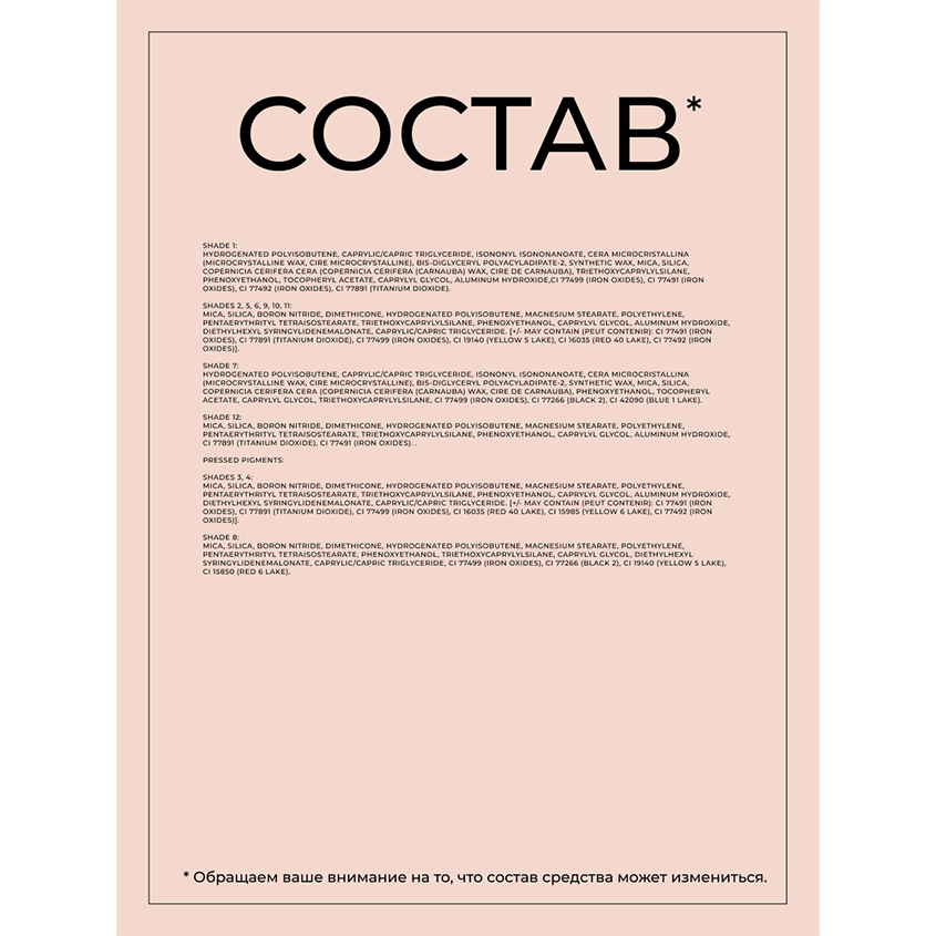 MICA, SILICA, BORON NITRIDE, DIMETHICONE, HYDROGENATED POLYISOBUTENE, MAGNESIUM STEARATE, POLYETHYLENE, PENTAERYTHRITYL TETRAISOSTEARATE, PHENOXYETHANOL, CAPRYLYL GLYCOL, TRIETHOXYCAPRYLYLSILANE. [+/- MAY CONTAIN (PEUT CONTENIR): CI 77491 (IRON OXIDES), CI 77492 (IRON OXIDES), CI 77499 (IRON OXIDES), CI 77891 (TITANIUM DIOXIDE), CI 42090 (BLUE 1 LAKE), CI 77266 (BLACK 2),].