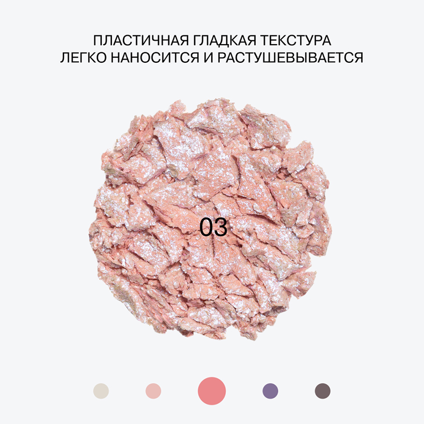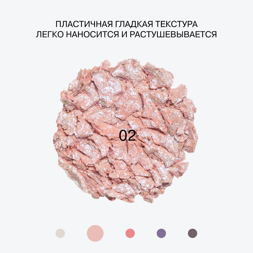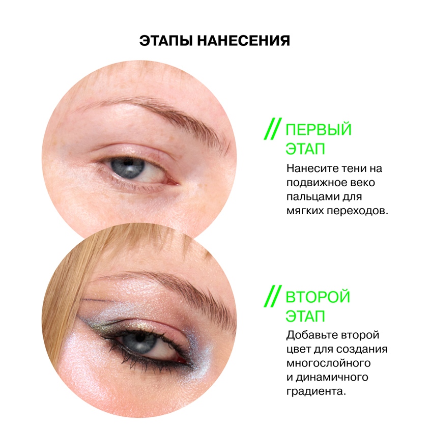 интенсивного эффекта можно наносить их на влажную основу: цвет станет ярче и насыщеннее. Тени хорошо переносятся, создавая ровное покрытие, и легко смешиваются между собой для многослойных динамичных переходов.