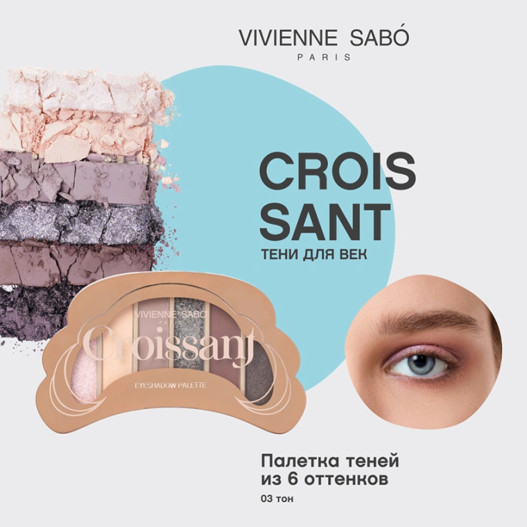 CROISSANT от VIVIENNE SABÓ — палетка теней из шести холодных оттенков с матовым и сияющим финишем. Почувствуй этот аромат свежеиспеченного круассана, атмосферу прогулки по утренним улочкам Парижа и магию французского шарма. В молочно-лиловой палитре — шесть тонов с невероятно мягкой текстурой, которые позволят создать как дневной, так и вечерний макияж. Каждый оттенок — это новый штрих к твоему образу, который сделает взгляд таким же манящим, как утренний кофе в парижском кафе. Тени легко наслаиваются и растушевываются, а милая упаковка в виде свежеиспеченного круассана никого не оставит равнодушным. Палетка теней CROISSANT от VIVIENNE SABÓ — твой десерт в любое время дня.