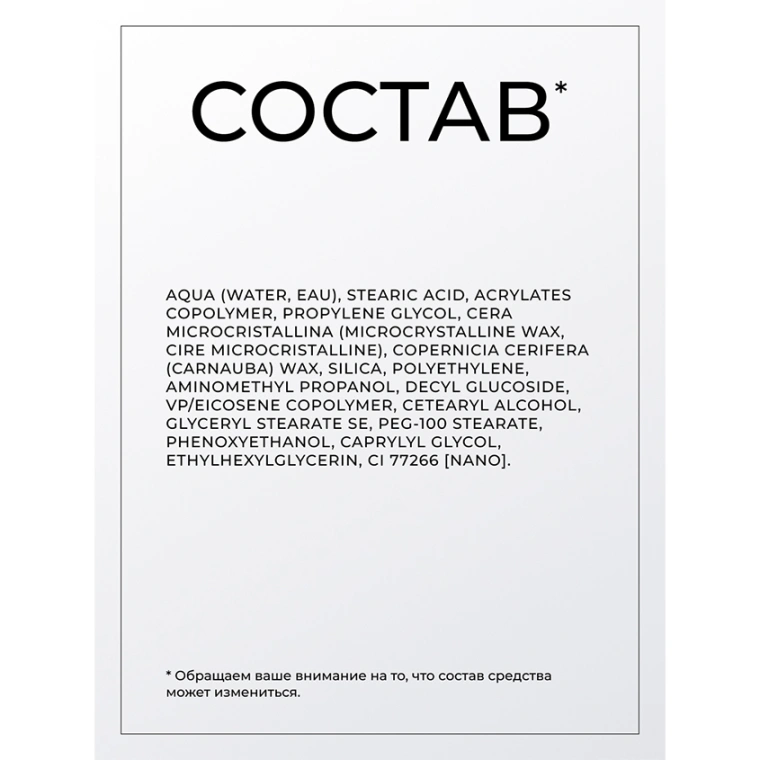 AQUA (WATER, EAU), ACRYLATES COPOLYMER, PETROLATUM, STEARIC ACID, PROPYLENE GLYCOL, VP/EICOSENE COPOLYMER, CERA MICROCRISTALLINA (MICROCRYSTALLINE WAX, CIRE MICROCRISTALLINE), COPERNICIA CERIFERA (CARNAUBA) WAX, SILICA, CETEARYL ALCOHOL, GLYCERYL STEARATE SE, PEG-100 STEARATE, AMINOMETHYL PROPANOL, PHENOXYETHANOL, CAPRYLYL GLYCOL, ETHYLHEXYLGLYCERIN, CI 77499 (IRON OXIDES).