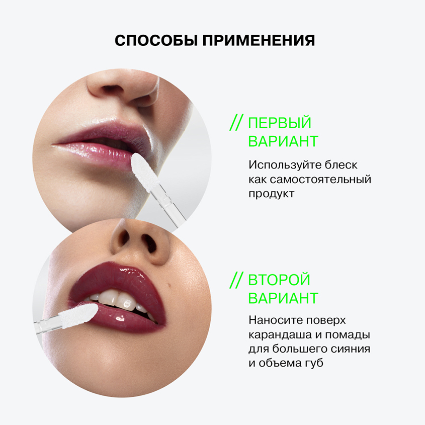 Используйте блеск для создания макияжа губ. Наносить аппликатором или кистью.