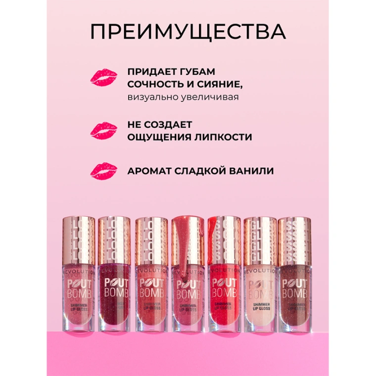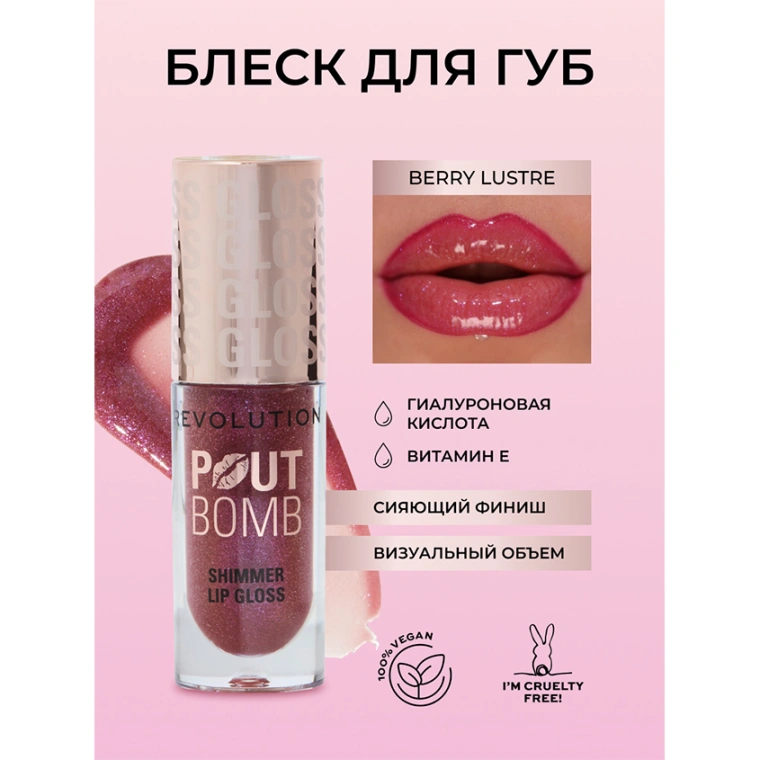 ПОГРУЗИСЬ В БУНТ СОЧНОСТИ! Блеск для губ POUT BOMB SHIMMER LIP GLOSS от MAKEUP REVOLUTION — это искра в твоём бьюти-бунте! Смелый объём, сияющий шиммер и полупрозрачные, но эффектные оттенки — твои губы теперь не просто деталь, а центр притяжения. Забудь про скучные текстуры — здесь начинается блеск без компромиссов. Готова заявить о себе громко и ярко? ПРОБУДИ СВОЮ ВНУТРЕННЮЮ БУНТАРКУ • Мерцающие оттенки — от нежного сияния до дерзкого гламура • Визуальный эффект увеличения — делай громкое заявление без слов • Сияющее покрытие с шиммером — для тех, кто выбирает светиться ЗА ЧТО ТЫ ПОЛЮБИШЬ POUT BOMB SHIMMER? • Ментоловое освежающее покалывание — мгновенный эффект plump • Увлажняющая формула с витамином Е — забота с первого прикосновения • Невесомая, не липкая текстура — комфорт 24/7 • Можно носить соло или поверх помады — идеален для экспериментов • Новый аромат сладкой ванили — и никакой липкости • Шиммер не ощущается на губах — только блеск, никакого дискомфорта • Яркие и игривые оттенки для каждого настроения ПРЕДСТАВЛЕН В СЕМИ ОТТЕНКАХ: • Jelly Berry Mauve – Прозрачный светло-лиловый оттенок в теплых тонах • Cherry Sheer Red – Прозрачный яркий вишнево-красный цвет • Milky Sheer Holo – Прозрачный переливающийся молочно-телесный оттенок • Rosewood Rose Pink – Насыщенный розовый цвет • Wild Mauve Pink – Теплый розовато-лиловый оттенок • Espresso Cool – Насыщенный коричневый цвет с холодным подтоном • Melba Warm Peach – Приглушённый персиково-оранжевый оттенок Revolution не используют компоненты животного происхождения и те, что тестируются на животных ни на одном из этапов производства. Создатели бренда убеждены, что все существа имеют право на жизнь и свободу. Веганский продукт.