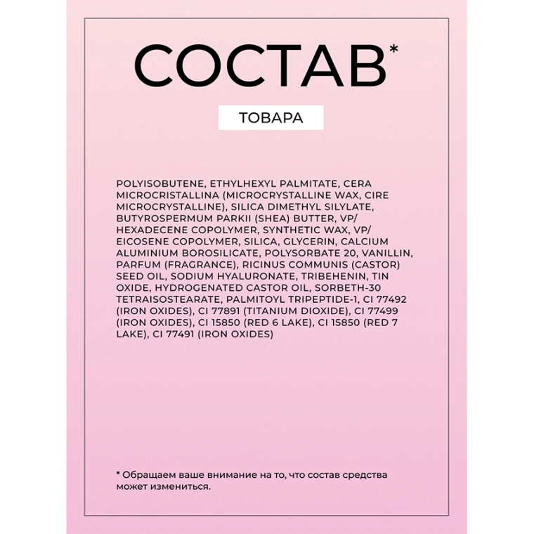 POLYISOBUTENE, ETHYLHEXYL PALMITATE, CERA MICROCRISTALLINA (MICROCRYSTALLINE WAX, CIRE MICROCRYSTALLINE), SILICA DIMETHYL SILYLATE, BUTYROSPERMUM PARKII (SHEA) BUTTER, VP/HEXADECENE COPOLYMER, SYNTHETIC WAX, VP/EICOSENE COPOLYMER, SILICA, GLYCERIN, POLYSORBATE 20, SYNTHETIC FLUORPHLOGOPITE, MICA, PARFUM (FRAGRANCE), RICINUS COMMUNIS (CASTOR) SEED OIL, SODIUM HYALURONATE, TRIBEHENIN, HYDROGENATED CASTOR OIL, SORBETH-30 TETRAISOSTEARATE, TIN OXIDE, PALMITOYL TRIPEPTIDE-1, VANILLIN, CI 77491 (IRON OXIDES), CI 77492 (IRON OXIDES), CI 77891 (TITANIUM DIOXIDE), CI 77499 (IRON OXIDES).
