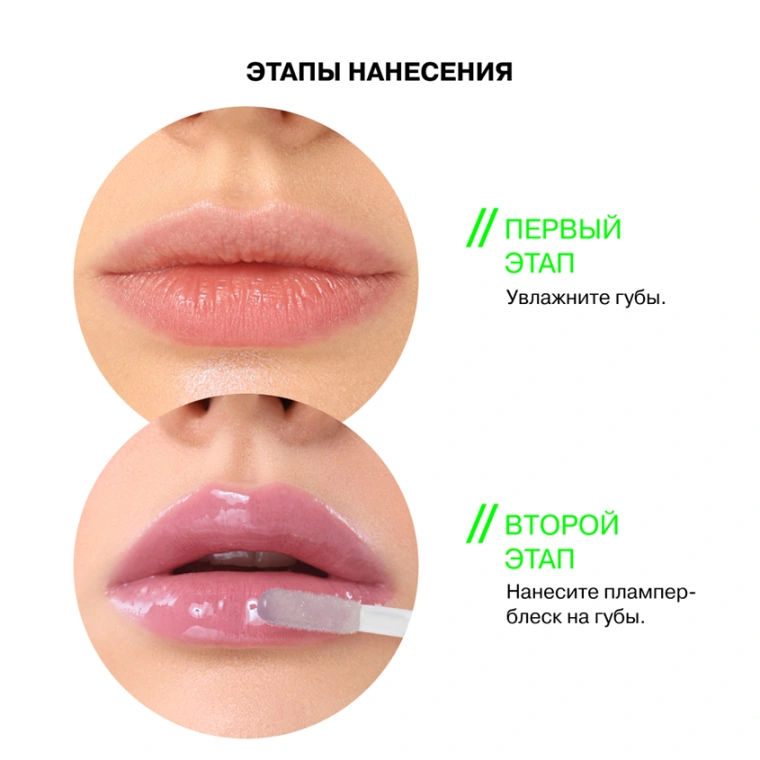 Для достижения максимального эффекта наносите плампер-блеск на заранее увлажненные губы. Для более