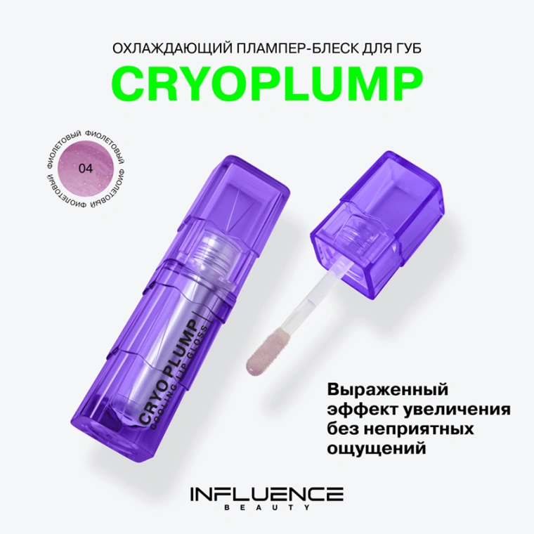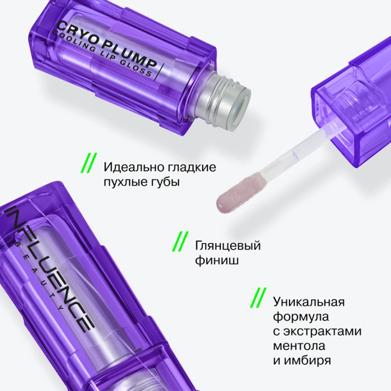 CRYOPLUMP — средство для губ от INFLUENCE BEAUTY с уникальной формулой, сочетающее в себе блеск и плампер. Технология микрокапсулирования COLDPROLONG высвобождает активные компоненты плампера постепенно, обеспечивая длительный эффект увеличения и комфортное ощущение прохлады на губах. По мере нанесения блеска сначала вы чувствуете мгновенное охлаждение, за которым следует легкое нагревание. За счет этого действие плампера компенсируется охлаждающим эффектом, нивелирующим жжение. Продукт обладает уникальной формулой с экстрактами ментола и имбиря. Это сочетание активных компонентов создает выраженный эффект увеличения объема губ при одновременном комфорте и отсутствии неприятных ощущений. Экстракт ментола обеспечивает локальное охлаждающее действие, которое не только усиливает сенсорные ощущения, но и играет ключевую роль в минимизации жжения плампера. Экстракт имбиря, известный своими сосудорасширяющими свойствами, стимулирует приток крови к губам, что визуально увеличивает их объем. CRYOPLUMP упакован в серебряный резервуар в полупрозрачном пластике, напоминающий колбу, словно застывшую в кусочке льда. Продукт с маневренным плоским аппликатором с длинными и мягкими ворсинками обладает плотной гелевой текстурой, которая заполняет все морщинки, выравнивая поверхность губ и создавая эффект жидкого стекла. В результате вы получаете идеально гладкие, пухлые, глянцевые губы. Плампер-блеск доступен в четырех полупрозрачных оттенках с ароматом черники, яблока, клубники и винограда.