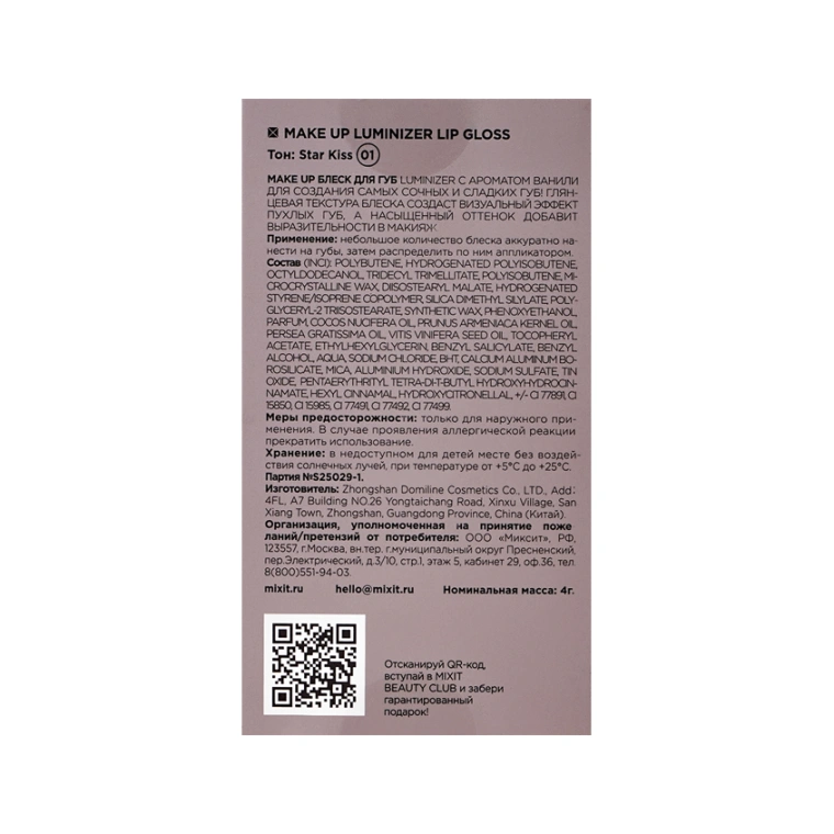 Блеск для губ `MIXIT` LUMINIZER LIP GLOSS глянцевый тон 01 Star kiss
