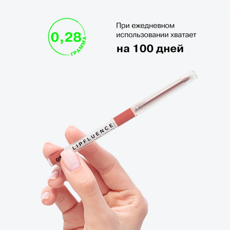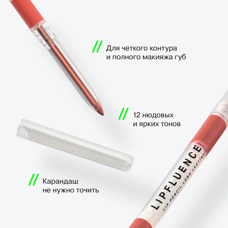 Автоматический карандаш LIPFLUENCE от INFLUENCE BEAUTY с мягкой гелевой текстурой легко наносить не только по контуру, но и по всей поверхности губ. Инновационная формула COLORLAZER гарантирует насыщенность и яркость цвета с первого нанесения, четкость контура и стойкость на весь день. Благодаря прозрачному матовому корпусу можно увидеть весь механизм работы карандаша. Перед нанесением карандаша, обязательно увлажните губы бальзамом LIPSKILL или маской для губ VOLUME DOSE от INFLUENCE BEAUTY. Для создания эффекта объемных губ выйдите за края своего естественного контура и используйте карандаш LIPFLUENCE на тон темнее вашей помады. Наносите карандаш на всю поверхность губ для большей стойкости и насыщенности цвета. По желанию сверху нанесите помаду INFLUENCE или блеск для губ PLEXIGLASS. В ассортименте 12 тонов. Продукция не тестируется на животных.