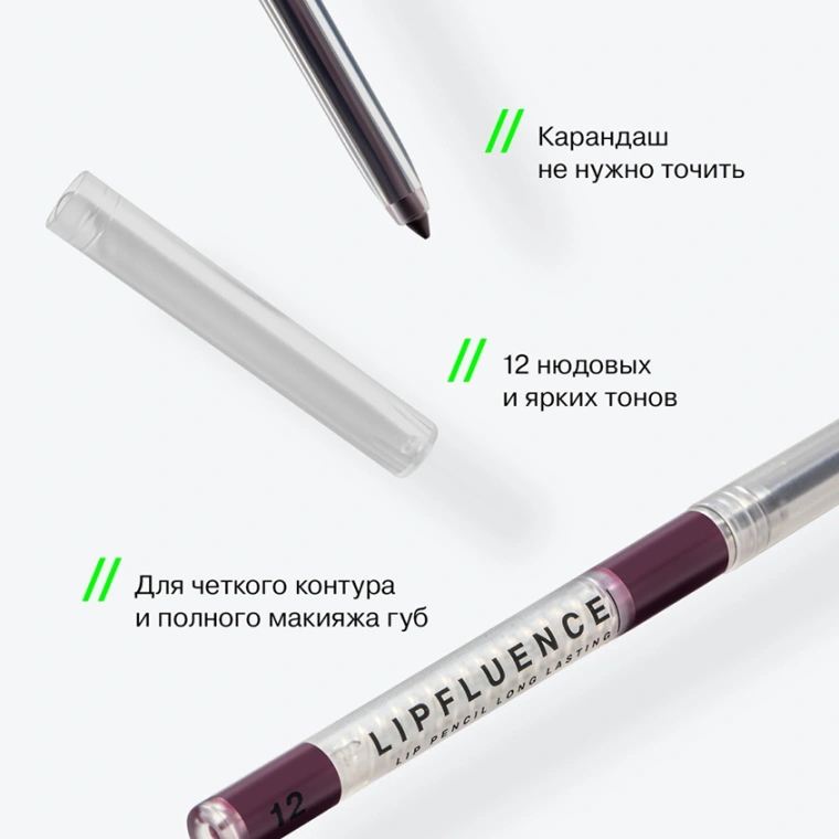 Автоматический карандаш LIPFLUENCE от INFLUENCE BEAUTY с мягкой гелевой текстурой легко наносить не только по контуру, но и по всей поверхности губ. Инновационная формула COLORLAZER гарантирует насыщенность и яркость цвета с первого нанесения, четкость контура и стойкость на весь день. Благодаря прозрачному матовому корпусу можно увидеть весь механизм работы карандаша. Перед нанесением карандаша, обязательно увлажните губы бальзамом LIPSKILL или маской для губ VOLUME DOSE от INFLUENCE BEAUTY. Для создания эффекта объемных губ выйдите за края своего естественного контура и используйте карандаш LIPFLUENCE на тон темнее вашей помады. Наносите карандаш на всю поверхность губ для большей стойкости и насыщенности цвета. По желанию сверху нанесите помаду INFLUENCE или блеск для губ PLEXIGLASS. В ассортименте 12 тонов. Продукция не тестируется на животных.