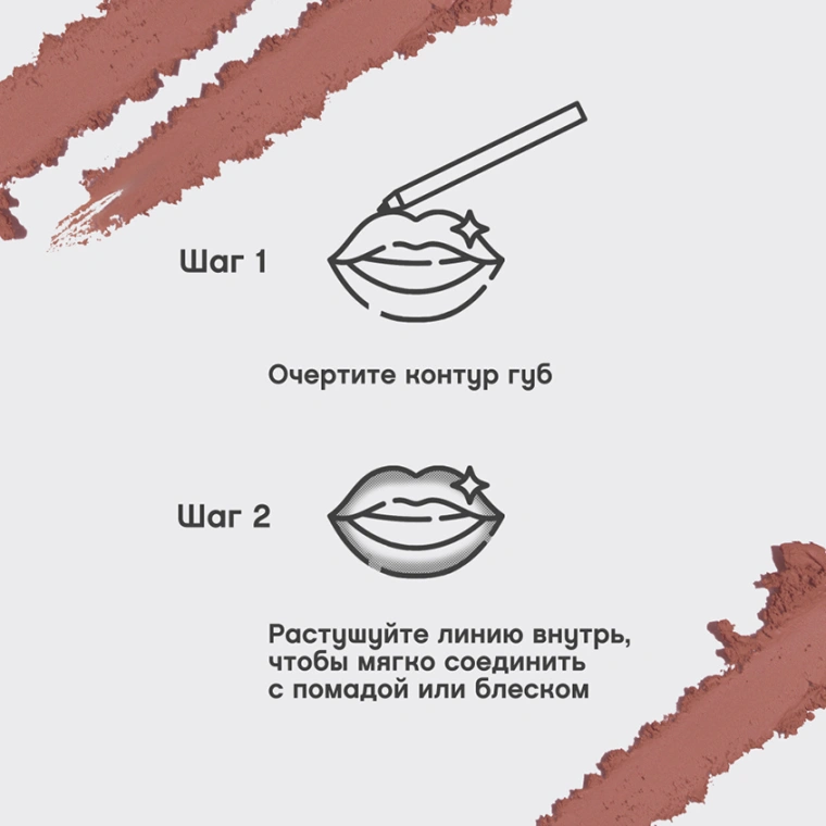 Очертить контур губ и растушевать линию внутрь, чтобы мягко соединить с помадой или блеском. Или