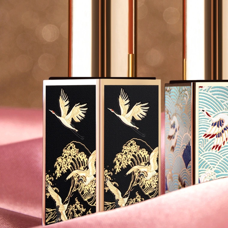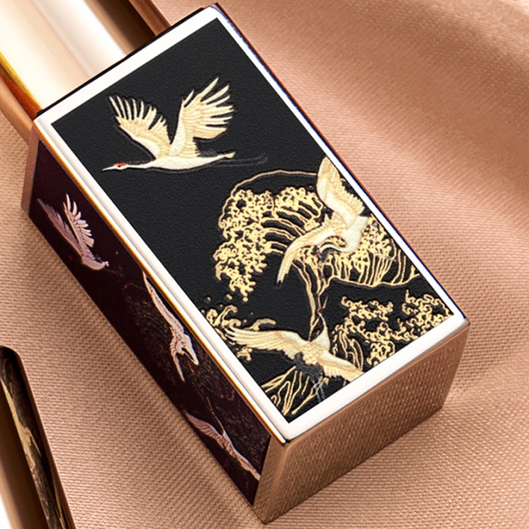 Футляр помады тона 130 украшают Журавли на черном фоне