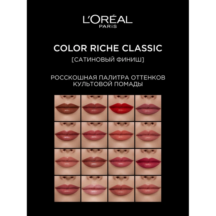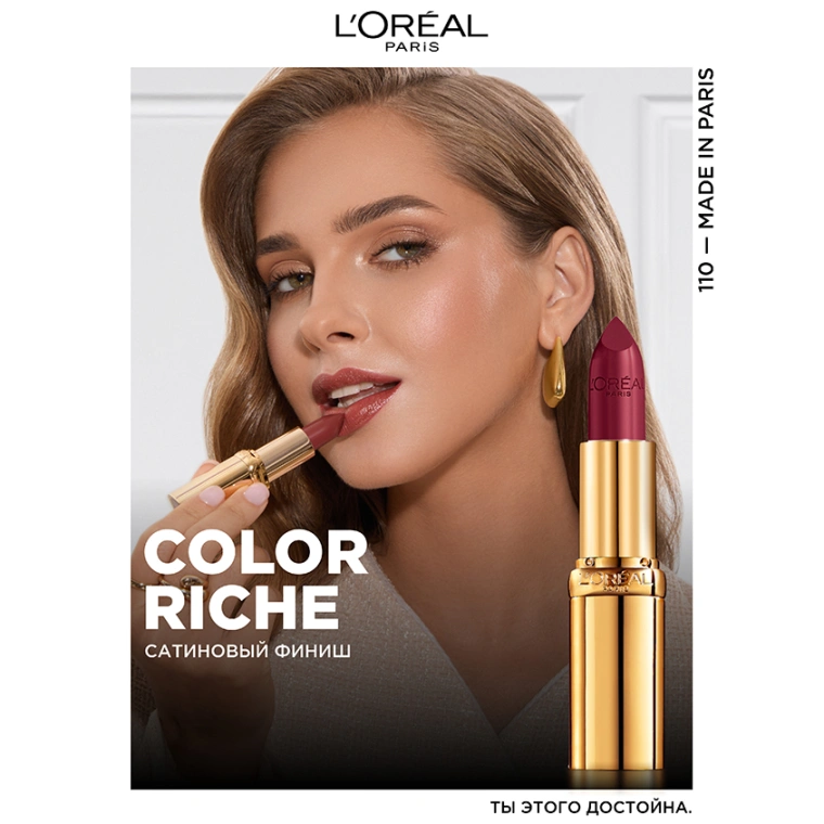 Color Riche – культовая помада L'Oréal Paris с 1985 года. Color Riche – сочетание насыщенных пигментов цвета и драгоценных масел в одном флаконе. Сатиновый финиш, скользящее нанесение, богатая палитра оттенков. 75% ухаживающих компонентов в составе. Экстракты камелии и лотоса, масло арганы и жожоба глубоко питают и увлажняют нежную кожу губ. Больше, чем цвет. Роскошь цвета и ухода за вашими губами.
