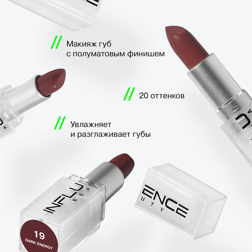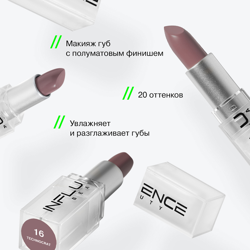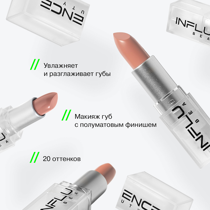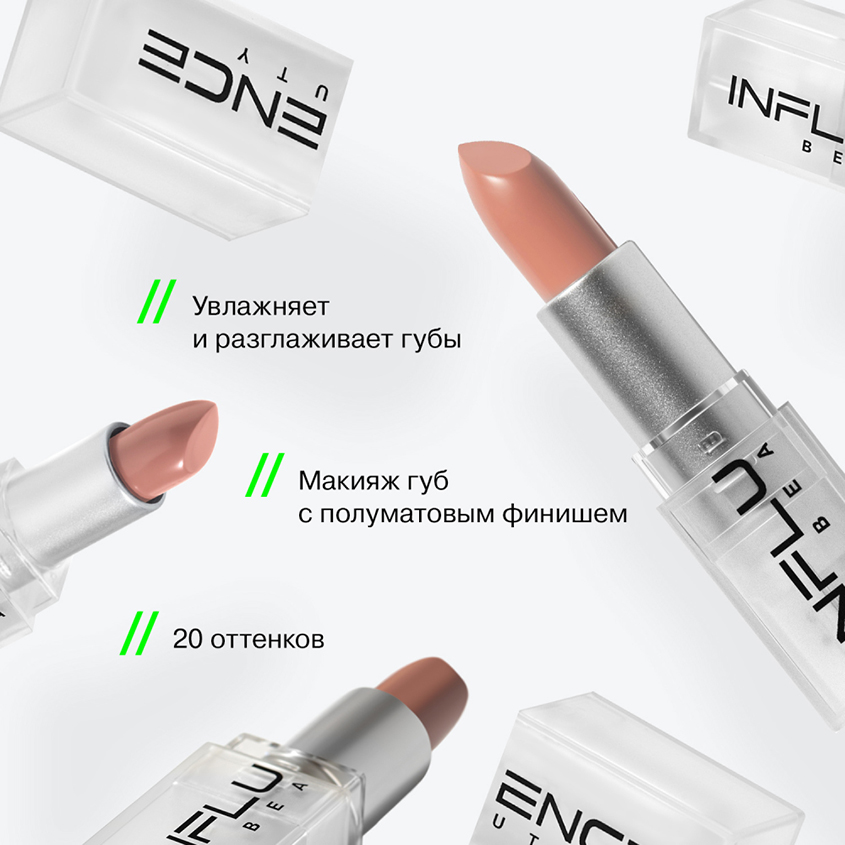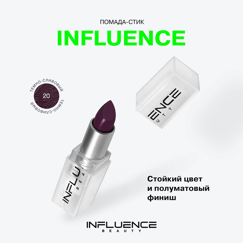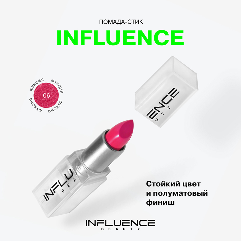 Взгляд на классику из будущего. INFLUENCE от INFLUENCE BEAUTY - уникальное сочетание всех лучших качеств помады-стика. Инновационная формула CONJUNCTION MIX отвечает за ее основные свойства: полуматовый финиш, стойкость, высокую пигментацию и равномерное нанесение с первого раза. Помада увлажняет и разглаживает губы. Полупрозрачный корпус, через который виден весь механизм помады INFLUENCE, подчеркивает ее лаконичность и функциональность. Используйте в качестве подложки карандаш LIPFLUENCE от INFLUENCE BEAUTY для насыщенного цвета. Чтобы цвет на губах сохранял стойкость в течения дня, слегка припудрите помаду после её нанесения пудрой SKINVISIBLE CARCASS от INFLUENCE BEAUTY. Для завершения образа нанесите выбранный оттенок помады на щеки и мягко растушуйте. В ассортименте 20 тонов. Продукция не тестируется на животных и не содержит в своём составе компонентов животного происхождения.