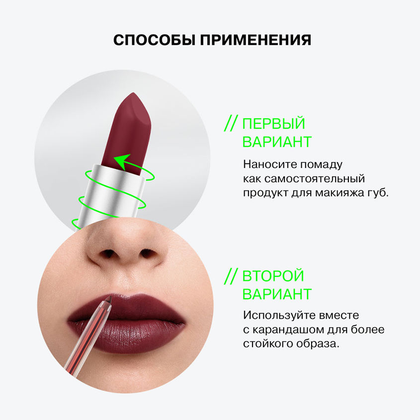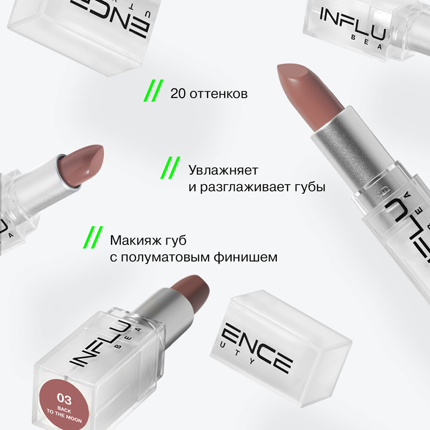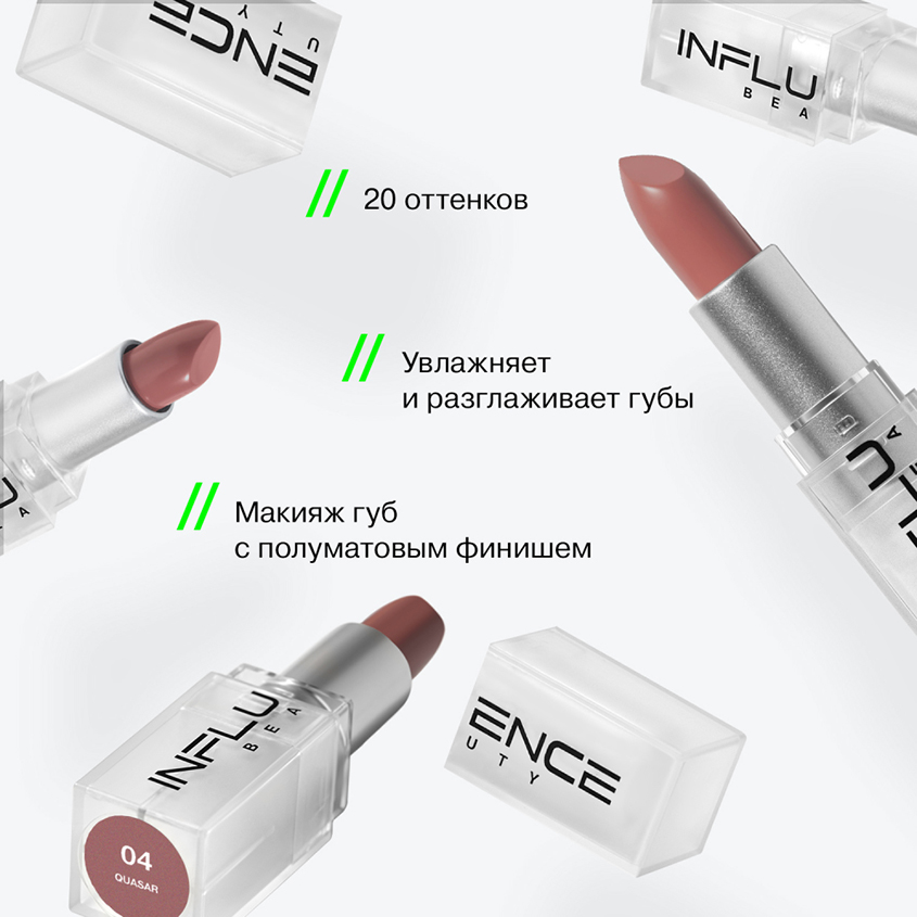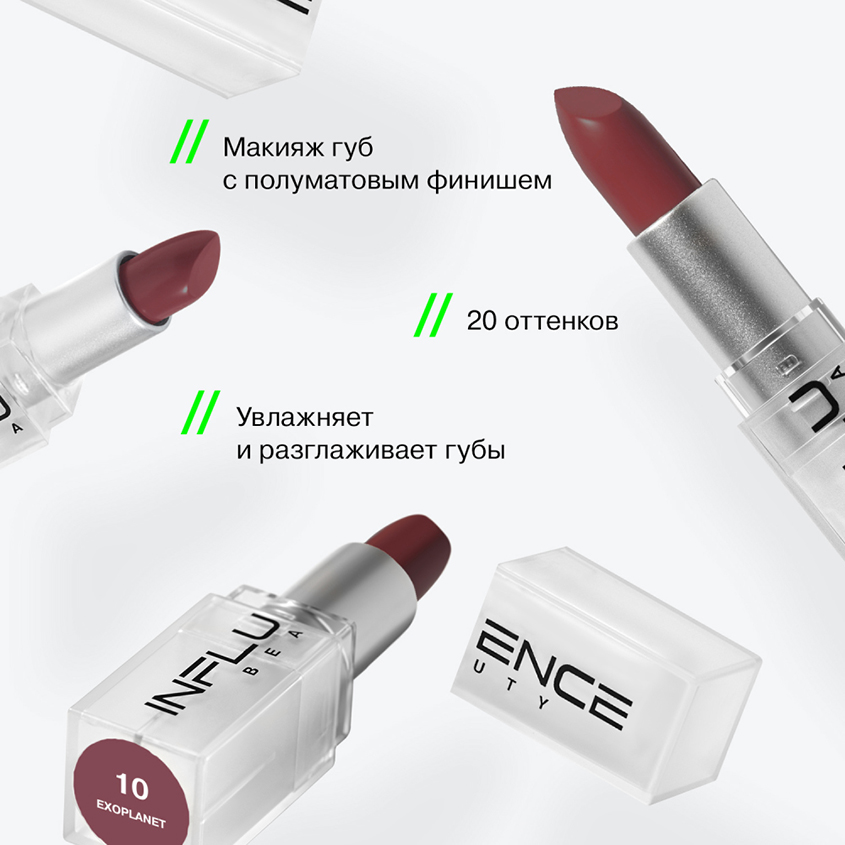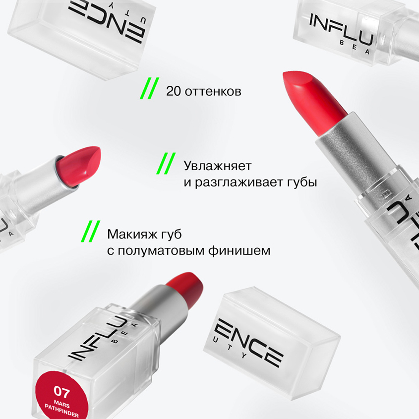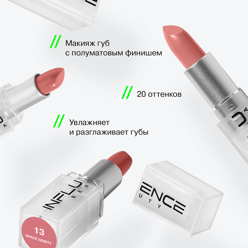 Взгляд на классику из будущего. INFLUENCE от INFLUENCE BEAUTY - уникальное сочетание всех лучших качеств помады-стика. Инновационная формула CONJUNCTION MIX отвечает за ее основные свойства: полуматовый финиш, стойкость, высокую пигментацию и равномерное нанесение с первого раза. Помада увлажняет и разглаживает губы. Полупрозрачный корпус, через который виден весь механизм помады INFLUENCE, подчеркивает ее лаконичность и функциональность. Используйте в качестве подложки карандаш LIPFLUENCE от INFLUENCE BEAUTY для насыщенного цвета. Чтобы цвет на губах сохранял стойкость в течения дня, слегка припудрите помаду после её нанесения пудрой SKINVISIBLE CARCASS от INFLUENCE BEAUTY. Для завершения образа нанесите выбранный оттенок помады на щеки и мягко растушуйте. В ассортименте 20 тонов. Продукция не тестируется на животных и не содержит в своём составе компонентов животного происхождения.
