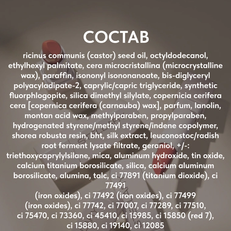 RICINUS COMMUNIS (CASTOR) SEED OIL, OCTYLDODECANOL, ETHYLHEXYL PALMITATE, CERA MICROCRISTALLINA (MICROCRYSTALLINE WAX), PARAFFIN, ISONONYL ISONONANOATE, BIS-DIGLYCERYL POLYACYLADIPATE-2, CAPRYLIC/CAPRIC TRIGLYCERIDE, SYNTHETIC FLUORPHLOGOPITE, SILICA DIMETHYL SILYLATE, COPERNICIA CERIFERA CERA [COPERNICA CERIFERA (CARNAUBA) WAX], PARFUM, LANOLIN, MONTAN ACID WAX, METHYLPARABEN, PROPYLPARABEN, HYDROGENATED STYRENE/METHYL STYRENE/INDENE COPOLYMER, SHOREA ROBUSTA RESIN, BHT, SILK EXTRACT, LEUCONOSTOC/RADISH ROOT FERMENT LYSATE FILTRATE, GERANIOL, +/-: TRIETHOXYCAPRYLYLSILANE, MICA, ALUMINUM HYDROXIDE, TIN OXIDE, CALCIUM TITANIUM BOROSILICATE, SILICA, CALCIUM ALUMINUM BOROSILICATE, ALUMINA, TALC, CI 77891 (TITANIUM DIOXIDE), CI 77491 (IRON OXIDES), CI 77492 (IRON OXIDES), CI 77499 (IRON OXIDES), CI 77742, CI 77007, CI 77289, CI 77510, CI 75470, CI 73360, CI 45410, CI 15985, CI 15850 (RED 7), CI 15880, CI 19140, CI 12085.