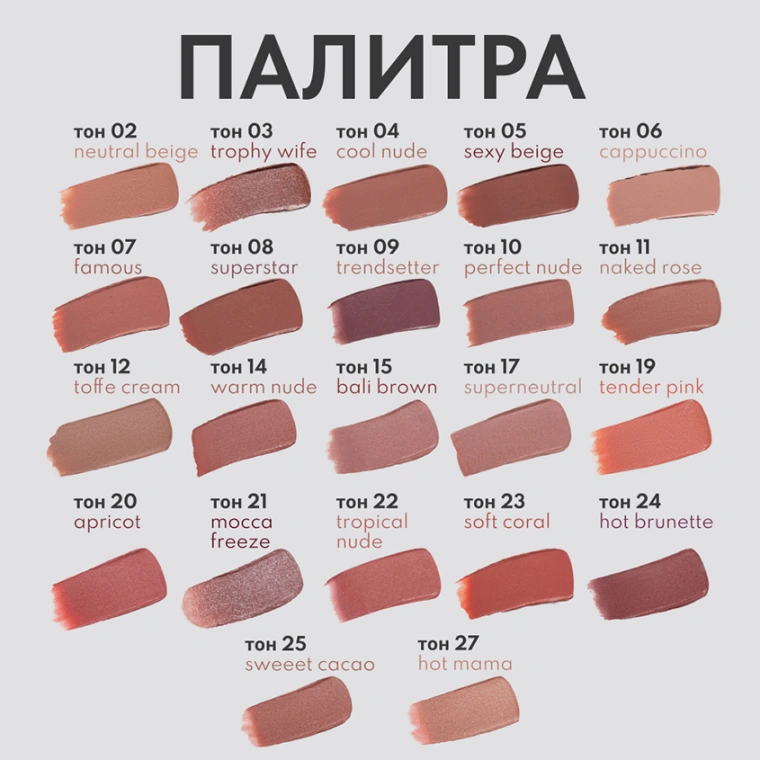 RICH NUDE — легендарная помада STELLARY с улучшенной формулой в элегантном и роскошном футляре-арке. Широкая палитра нюдовых оттенков для макияжа, в котором вы будете еще притягательнее и шикарнее. У RICH NUDE самая широкая ультрамодная палитра естественных оттенков — 22 тона для безупречных макияжей в стиле nude makeup. Помада с обновленной текстурой сохранила стойкость и высокую пигментацию, а полезные компоненты в ее составе обеспечивают уход за кожей губ. Экстракт шелка питает губы, насыщает микро- и макроэлементами, повышает упругость кожи. Экстракт кашемира содержит богатую смесь аминокислот, благотворно влияющих на кожу губ. Cмола Shorea Robusta смягчает кожу губ, обладает омолаживающими свойствами за счет высокого содержания ненасыщенных жирных кислот. Эмоленты обеспечивают мягкость текстуры и легкость нанесения, предотвращают высыхание продукта. Помада RICH NUDE упакована в изысканный бежевый футляр-арку с золотой печатью, вдохновленный плавными изгибами женского тела, струящимися тканями люксовых платьев и вечной классикой. Лаконичная матовая упаковка доставляет тактильное и визуальное удовольствие, как любой предмет роскоши.