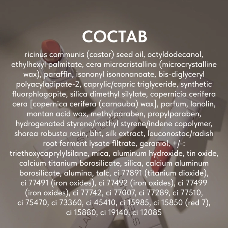 RICINUS COMMUNIS (CASTOR) SEED OIL, OCTYLDODECANOL, ETHYLHEXYL PALMITATE, CERA MICROCRISTALLINA (MICROCRYSTALLINE WAX), PARAFFIN, ISONONYL ISONONANOATE, BIS-DIGLYCERYL POLYACYLADIPATE-2, CAPRYLIC/CAPRIC TRIGLYCERIDE, SYNTHETIC FLUORPHLOGOPITE, SILICA DIMETHYL SILYLATE, COPERNICIA CERIFERA CERA [COPERNICA CERIFERA (CARNAUBA) WAX], PARFUM, LANOLIN, MONTAN ACID WAX, METHYLPARABEN, PROPYLPARABEN, HYDROGENATED STYRENE/METHYL STYRENE/INDENE COPOLYMER, SHOREA ROBUSTA RESIN, BHT, SILK EXTRACT, LEUCONOSTOC/RADISH ROOT FERMENT LYSATE FILTRATE, GERANIOL, +/-: TRIETHOXYCAPRYLYLSILANE, MICA, ALUMINUM HYDROXIDE, TIN OXIDE, CALCIUM TITANIUM BOROSILICATE, SILICA, CALCIUM ALUMINUM BOROSILICATE, ALUMINA, TALC, CI 77891 (TITANIUM DIOXIDE), CI 77491 (IRON OXIDES), CI 77492 (IRON OXIDES), CI 77499 (IRON OXIDES), CI 77742, CI 77007, CI 77289, CI 77510, CI 75470, CI 73360, CI 45410, CI 15985, CI 15850 (RED 7), CI 15880, CI 19140, CI 12085.