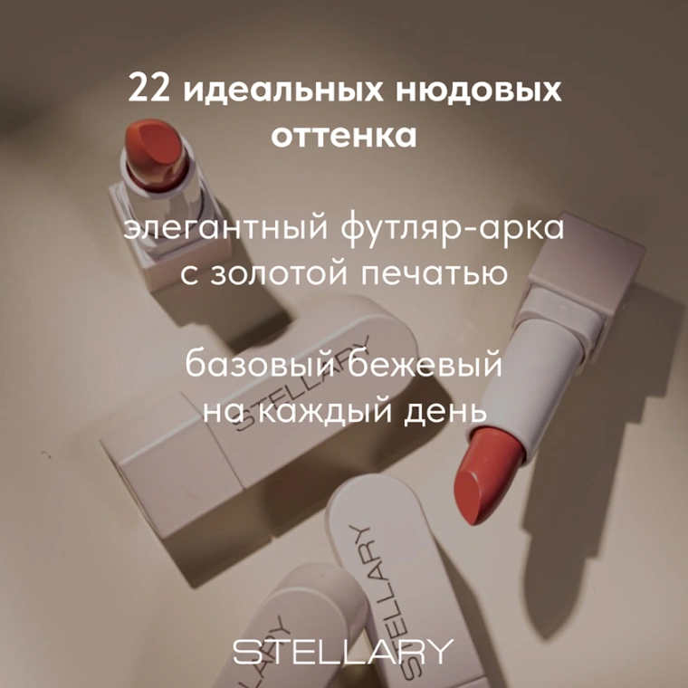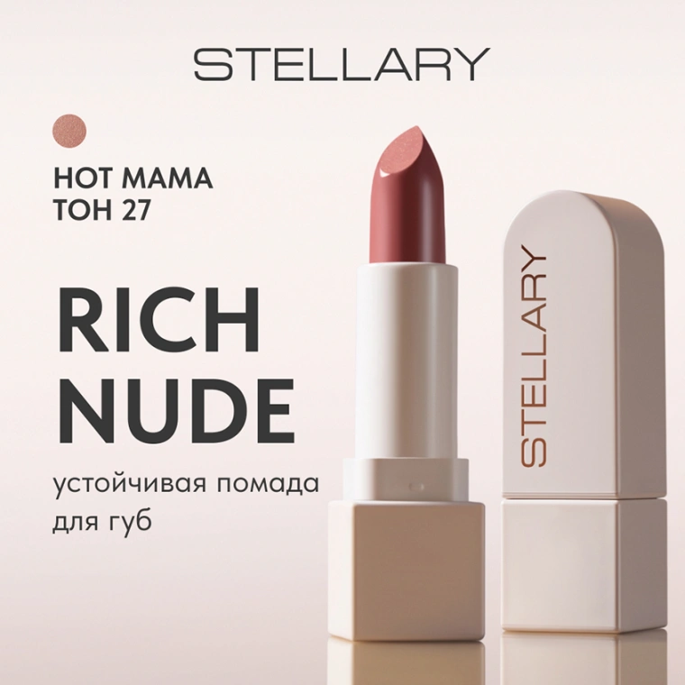 RICH NUDE — легендарная помада STELLARY с улучшенной формулой в элегантном и роскошном футляре-арке. Широкая палитра нюдовых оттенков для макияжа, в котором вы будете еще притягательнее и шикарнее. У RICH NUDE самая широкая ультрамодная палитра естественных оттенков — 22 тона для безупречных макияжей в стиле nude makeup. Помада с обновленной текстурой сохранила стойкость и высокую пигментацию, а полезные компоненты в ее составе обеспечивают уход за кожей губ. Экстракт шелка питает губы, насыщает микро- и макроэлементами, повышает упругость кожи. Экстракт кашемира содержит богатую смесь аминокислот, благотворно влияющих на кожу губ. Cмола Shorea Robusta смягчает кожу губ, обладает омолаживающими свойствами за счет высокого содержания ненасыщенных жирных кислот. Эмоленты обеспечивают мягкость текстуры и легкость нанесения, предотвращают высыхание продукта. Помада RICH NUDE упакована в изысканный бежевый футляр-арку с золотой печатью, вдохновленный плавными изгибами женского тела, струящимися тканями люксовых платьев и вечной классикой. Лаконичная матовая упаковка доставляет тактильное и визуальное удовольствие, как любой предмет роскоши.