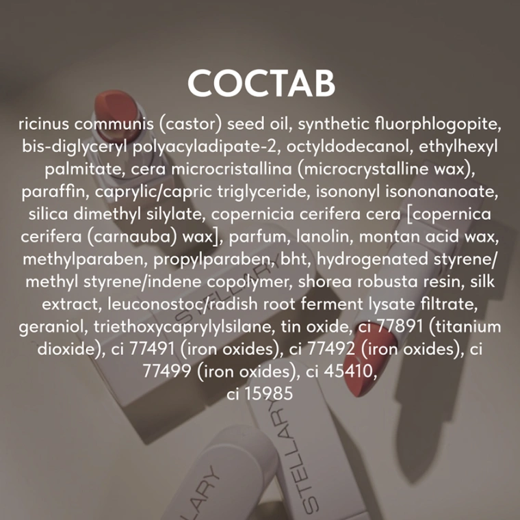 RICINUS COMMUNIS (CASTOR) SEED OIL, OCTYLDODECANOL, ETHYLHEXYL PALMITATE, CERA MICROCRISTALLINA (MICROCRYSTALLINE WAX), PARAFFIN, ISONONYL ISONONANOATE, BIS-DIGLYCERYL POLYACYLADIPATE-2, CAPRYLIC/CAPRIC TRIGLYCERIDE, SYNTHETIC FLUORPHLOGOPITE, SILICA DIMETHYL SILYLATE, COPERNICIA CERIFERA CERA [COPERNICA CERIFERA (CARNAUBA) WAX], PARFUM, LANOLIN, MONTAN ACID WAX, METHYLPARABEN, PROPYLPARABEN, HYDROGENATED STYRENE/METHYL STYRENE/INDENE COPOLYMER, SHOREA ROBUSTA RESIN, BHT, SILK EXTRACT, LEUCONOSTOC/RADISH ROOT FERMENT LYSATE FILTRATE, GERANIOL, +/-: TRIETHOXYCAPRYLYLSILANE, MICA, ALUMINUM HYDROXIDE, TIN OXIDE, CALCIUM TITANIUM BOROSILICATE, SILICA, CALCIUM ALUMINUM BOROSILICATE, ALUMINA, TALC, CI 77891 (TITANIUM DIOXIDE), CI 77491 (IRON OXIDES), CI 77492 (IRON OXIDES), CI 77499 (IRON OXIDES), CI 77742, CI 77007, CI 77289, CI 77510, CI 75470, CI 73360, CI 45410, CI 15985, CI 15850 (RED 7), CI 15880, CI 19140, CI 12085.