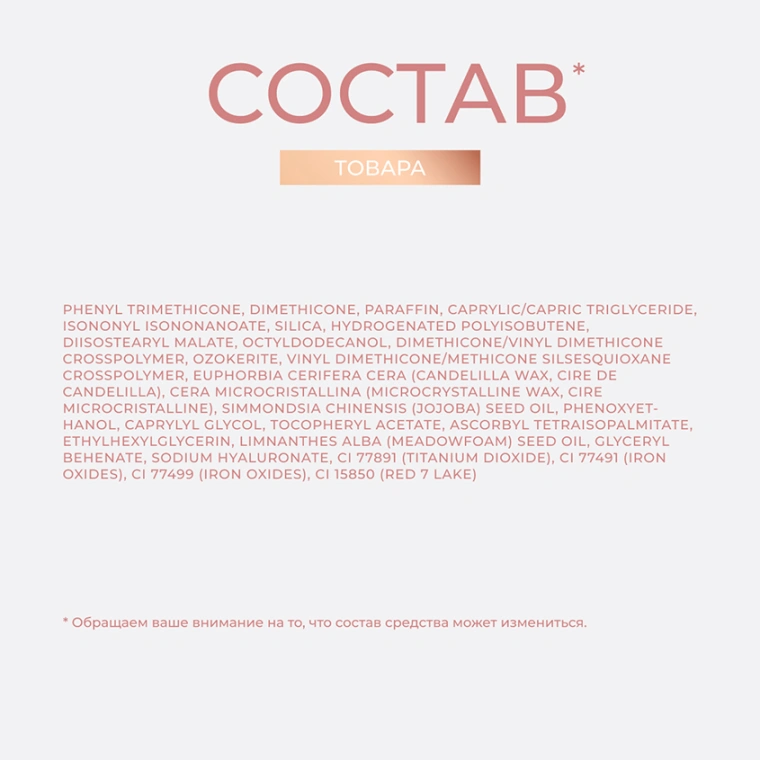 PHENYL TRIMETHICONE, DIMETHICONE, PARAFFIN,CAPRYLIC/CAPRIC TRIGLYCERIDE, ISONONYL ISONONANOATE, SILICA, HYDROGENATED POLYISOBUTENE, DIISOSTEARYL MALATE, OCTYLDODECANOL, DIMETHICONE/VINYL DIMETHICONE CROSSPOLYMER, OZOKERITE, VINYL DIMETHICONE/METHICONE SILSESQUIOXANE CROSSPOLYMER, EUPHORBIA CERIFERA CERA (CANDELILLA WAX, CIRE DE CANDELILLA),CERA MICROCRISTALLINA (MICROCRYSTALLINE WAX, CIRE MICROCRISTALLINE), SIMMONDSIA CHINENSIS (JOJOBA) SEED OIL, PHENOXYETHANOL, CAPRYLYL GLYCOL, TOCOPHERYL ACETATE, ASCORBYL TETRAISOPALMITATE, ETHYLHEXYLGLYCERIN, LIMNANTHES ALBA (MEADOWFOAM) SEED OIL, GLYCERYL BEHENATE,SODIUM HYALURONATE,CI 77891(TITANIUM DIOXIDE), CI 77499(IRON OXIDES),CI 77491(IRON OXIDES),CI 15850(RED 7 LAKE).