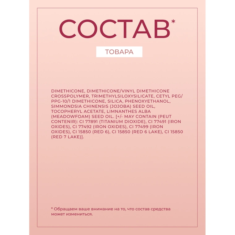 DIMETHICONE, DIMETHICONE/VINYL DIMETHICONE CROSSPOLYMER, TRIMETHYLSILOXYSILICATE, CETYL PEG/PPG-10/1 DIMETHICONE, SILICA, PHENOXYETHANOL, SIMMONDSIA CHINENSIS (JOJOBA) SEED OIL, TOCOPHERYL ACETATE, LIMNANTHES ALBA (MEADOWFOAM) SEED OIL. [+/- MAY CONTAIN (PEUT CONTENIR): CI 77891 (TITANIUM DIOXIDE), CI 77491 (IRON OXIDES), CI 77492 (IRON OXIDES), CI 77499 (IRON OXIDES), CI 15985 (YELLOW 6 LAKE), CI 15850 (RED 6), CI 15850 (RED 6 LAKE), CI 15850 (RED 7 LAKE),CI 45410 (RED 28 LAKE)].