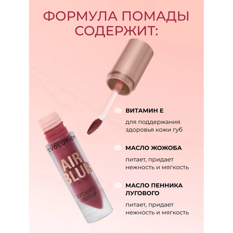 НЕВЕСОМОЕ МАТОВОЕ СОВЕРШЕНСТВО ВСЕГДА С ТОБОЙ! Жидкая матовая помада AIR BLUR LIQUID LIPSTICK от MAKEUP REVOLUTION — это ультралёгкая текстура и насыщенный пигмент в одном флаконе! Формула с эффектом воздушного покрытия создаёт ровный бархатистый финиш без сухости и стянутости. Помада будто тает на губах, даря ощущение «второй кожи» и стойкий, выразительный оттенок на целый день. ПОДЧЕРКНИ СВОЮ УНИКАЛЬНУЮ УЛЫБКУ • Лёгкая текстура — комфортное нанесение без утяжеления • Бархатистое покрытие — гладкие и соблазнительные губы • Стойкий матовый финиш — без ощущения сухости • Удобный аппликатор — точное нанесение даже без контура ПОЧЕМУ ТЫ ПОЛЮБИШЬ AIR BLUR LIQUID LIPSTICK? • Комфортная формула на каждый день • Богатая палитра оттенков — от нюдовых до ярких • Стойкость до 12 часов — макияж, который держится • Не отпечатывается — можно не бояться следов • Подходит для всех типов кожи и форм губ ПРЕДСТАВЛЕНЫ В 10 ОТТЕНКАХ: • Chauffeur – насыщенный нюд • Dreamy – холодный красный • Rosewood – тёмно-красный с фиолетовым подтоном • Siren – коричневый нюд • Black Cherry – холодный сливовый • Fiery – насыщенный красный • Coco – классический коричневый • Fawn – тауповый коричневый • Ballet – персиково-розовый • Peachy – светло-розовый с лиловым подтоном ФОРМУЛА СОДЕРЖИТ: • Смягчающие масла — для увлажнения и комфорта • Пудровые пигменты — для бархатного финиша • Полимеры — для стойкости и эластичности покрытия Revolution не используют компоненты животного происхождения и те, что тестируются на животных ни на одном из этапов производства. Создатели бренда убеждены, что все существа имеют право на жизнь и свободу. Веганский продукт.