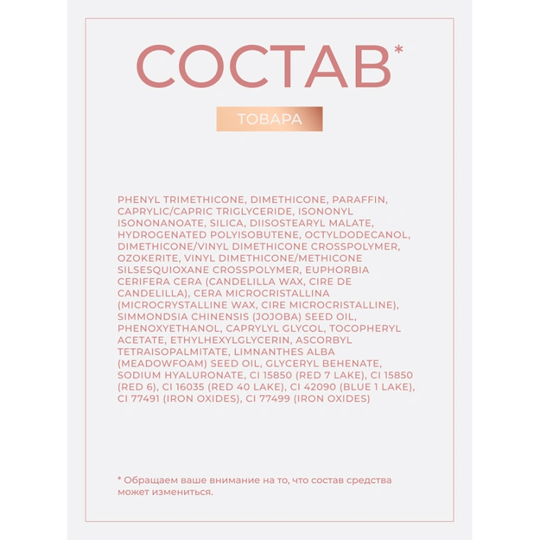 PHENYL TRIMETHICONE, DIMETHICONE, PARAFFIN,CAPRYLIC/CAPRIC TRIGLYCERIDE, ISONONYL ISONONANOATE, SILICA, HYDROGENATED POLYISOBUTENE, DIISOSTEARYL MALATE, OCTYLDODECANOL, DIMETHICONE/VINYL DIMETHICONE CROSSPOLYMER, OZOKERITE, VINYL DIMETHICONE/METHICONE SILSESQUIOXANE CROSSPOLYMER, EUPHORBIA CERIFERA CERA (CANDELILLA WAX, CIRE DE CANDELILLA),CERA MICROCRISTALLINA (MICROCRYSTALLINE WAX, CIRE MICROCRISTALLINE), SIMMONDSIA CHINENSIS (JOJOBA) SEED OIL, PHENOXYETHANOL, CAPRYLYL GLYCOL, TOCOPHERYL ACETATE, ASCORBYL TETRAISOPALMITATE, ETHYLHEXYLGLYCERIN, LIMNANTHES ALBA (MEADOWFOAM) SEED OIL, GLYCERYL BEHENATE,SODIUM HYALURONATE,CI 77891(TITANIUM DIOXIDE), CI 77499(IRON OXIDES),CI 77491(IRON OXIDES),CI 15850(RED 7 LAKE).