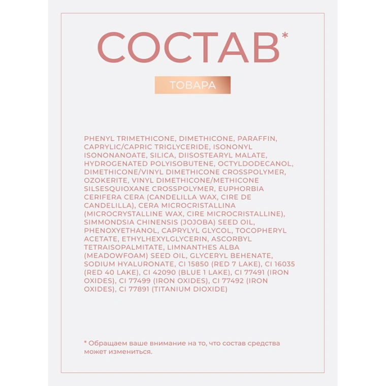 PHENYL TRIMETHICONE, DIMETHICONE, PARAFFIN,CAPRYLIC/CAPRIC TRIGLYCERIDE, ISONONYL ISONONANOATE, SILICA, HYDROGENATED POLYISOBUTENE, DIISOSTEARYL MALATE, OCTYLDODECANOL, DIMETHICONE/VINYL DIMETHICONE CROSSPOLYMER, OZOKERITE, VINYL DIMETHICONE/METHICONE SILSESQUIOXANE CROSSPOLYMER, EUPHORBIA CERIFERA CERA (CANDELILLA WAX, CIRE DE CANDELILLA),CERA MICROCRISTALLINA (MICROCRYSTALLINE WAX, CIRE MICROCRISTALLINE), SIMMONDSIA CHINENSIS (JOJOBA) SEED OIL, PHENOXYETHANOL, CAPRYLYL GLYCOL, TOCOPHERYL ACETATE, ASCORBYL TETRAISOPALMITATE, ETHYLHEXYLGLYCERIN, LIMNANTHES ALBA (MEADOWFOAM) SEED OIL, GLYCERYL BEHENATE,SODIUM HYALURONATE,CI 77891(TITANIUM DIOXIDE), CI 77499(IRON OXIDES),CI 77491(IRON OXIDES),CI 15850(RED 7 LAKE).