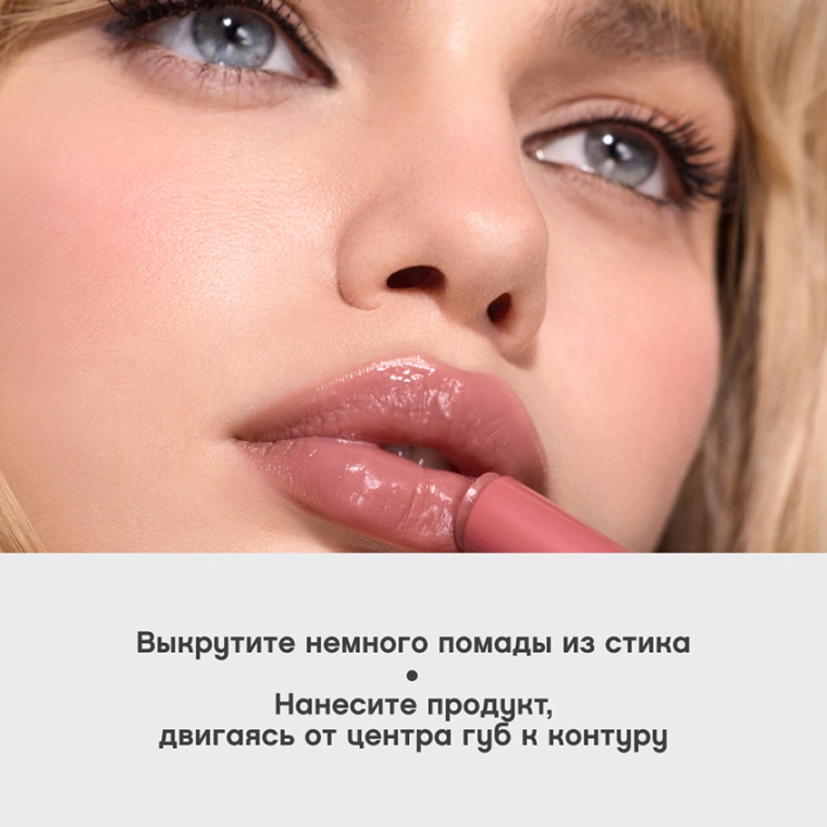Наносите помаду-бальзам как самостоятельный продукт для увлажнения и глосс-эффекта, в паре с