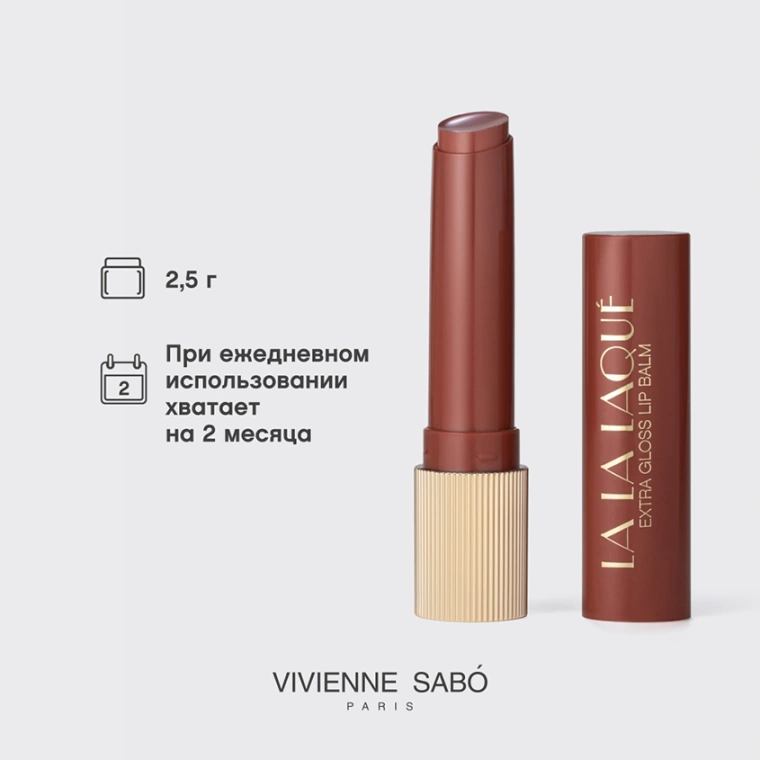 LA LA LAQUE от VIVIENNE SABÓ — глянцевая помада-бальзам с тающей текстурой для лаковых мягких губ. Представь себя в невероятном романтическом фильме от культового режиссера, где ты — главная героиня! Что ждет тебя завтра: головокружительный успех или встреча с любовью всей жизни? Что же предпочтешь ты? Точно знаем, что для своего кинофильма ты выберешь нежную помаду-бальзам для губ LA LA LAQUE с фруктовым ароматом личи. Ее уникальная специально разработанная мягкая тающая текстура на основе питательных масел позволяет достичь суперглянцевого эффекта и интенсивно увлажняет кожу. В палитре есть восемь тонов — от розовых до коричневых, которые подойдут на каждый день. LA LA LAQUE упакована в стик с ребристым золотистым основанием и крышкой в тон помады-бальзама. Механизм футляра позволяет выкрутить небольшое количество продукта для использования, что так важно для тающей текстуры. Обволакивающая помада-бальзам с полупрозрачным лаковым финишем сделает твои губы самыми притягательными для поцелуя в финальной сцене.