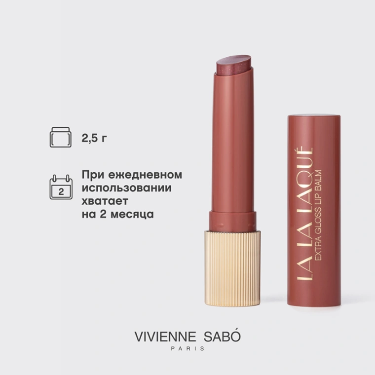 LA LA LAQUE от VIVIENNE SABÓ — глянцевая помада-бальзам с тающей текстурой для лаковых мягких губ. Представь себя в невероятном романтическом фильме от культового режиссера, где ты — главная героиня! Что ждет тебя завтра: головокружительный успех или встреча с любовью всей жизни? Что же предпочтешь ты? Точно знаем, что для своего кинофильма ты выберешь нежную помаду-бальзам для губ LA LA LAQUE с фруктовым ароматом личи. Ее уникальная специально разработанная мягкая тающая текстура на основе питательных масел позволяет достичь суперглянцевого эффекта и интенсивно увлажняет кожу. В палитре есть восемь тонов — от розовых до коричневых, которые подойдут на каждый день. LA LA LAQUE упакована в стик с ребристым золотистым основанием и крышкой в тон помады-бальзама. Механизм футляра позволяет выкрутить небольшое количество продукта для использования, что так важно для тающей текстуры. Обволакивающая помада-бальзам с полупрозрачным лаковым финишем сделает твои губы самыми притягательными для поцелуя в финальной сцене.