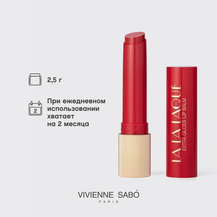 LA LA LAQUE от VIVIENNE SABÓ — глянцевая помада-бальзам с тающей текстурой для лаковых мягких губ. Представь себя в невероятном романтическом фильме от культового режиссера, где ты — главная героиня! Что ждет тебя завтра: головокружительный успех или встреча с любовью всей жизни? Что же предпочтешь ты? Точно знаем, что для своего кинофильма ты выберешь нежную помаду-бальзам для губ LA LA LAQUE с фруктовым ароматом личи. Ее уникальная специально разработанная мягкая тающая текстура на основе питательных масел позволяет достичь суперглянцевого эффекта и интенсивно увлажняет кожу. В палитре есть восемь тонов — от розовых до коричневых, которые подойдут на каждый день. LA LA LAQUE упакована в стик с ребристым золотистым основанием и крышкой в тон помады-бальзама. Механизм футляра позволяет выкрутить небольшое количество продукта для использования, что так важно для тающей текстуры. Обволакивающая помада-бальзам с полупрозрачным лаковым финишем сделает твои губы самыми притягательными для поцелуя в финальной сцене.