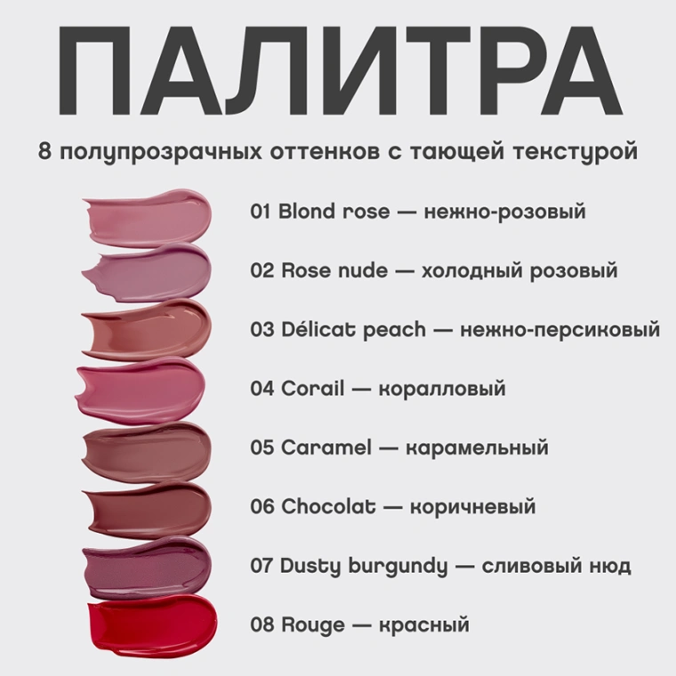 карандашом для более четкого контура, поверх матовой или сатиновой помады для влажного финиша. Продукт можно наслаивать для яркости цвета.
