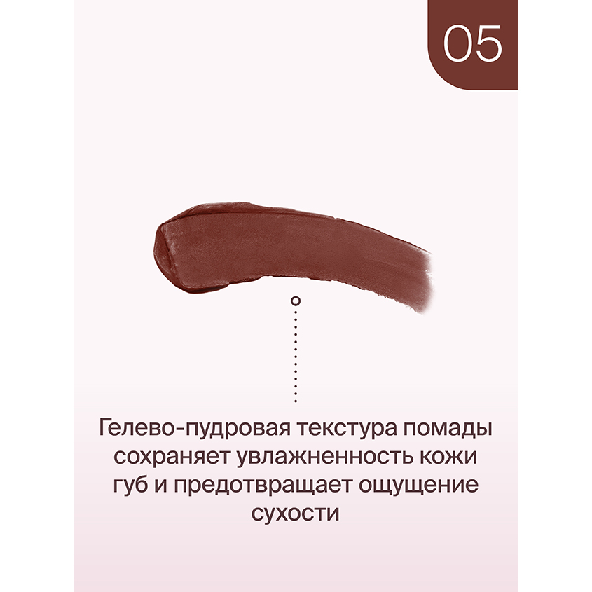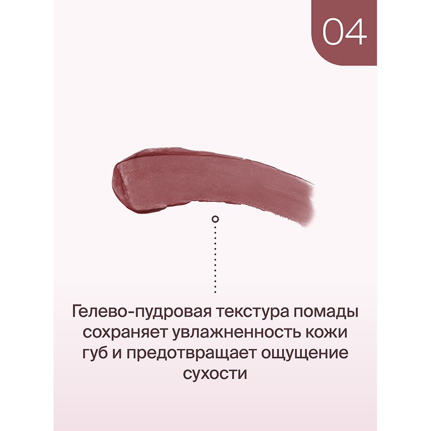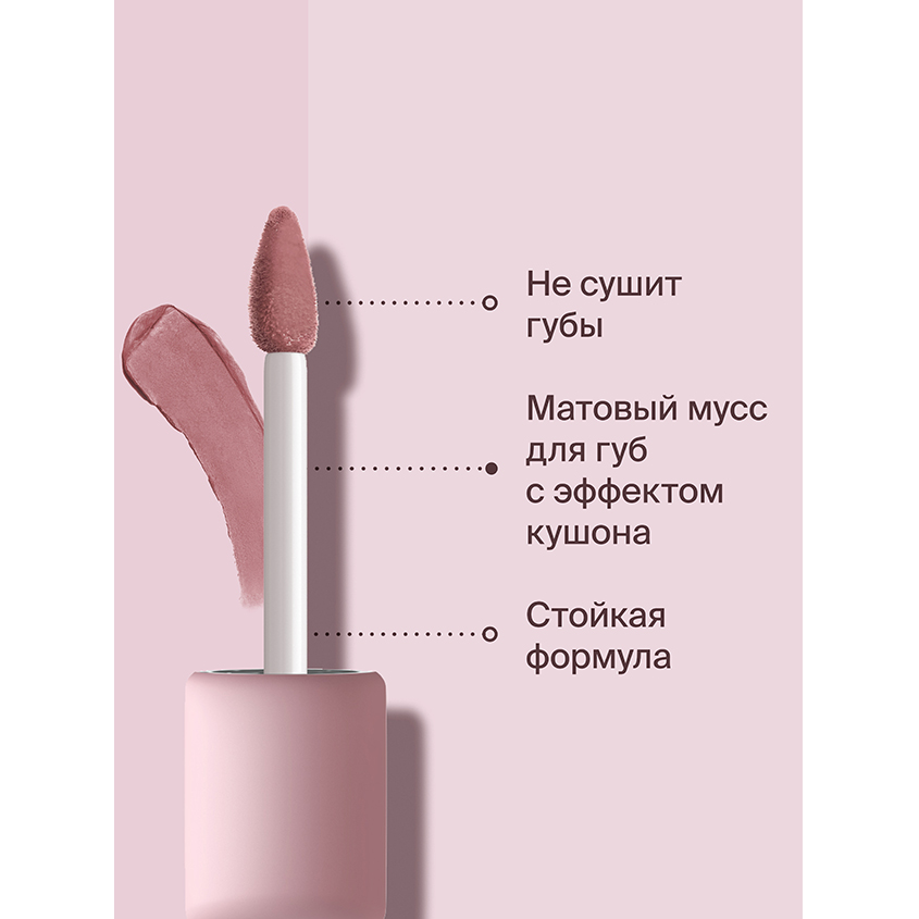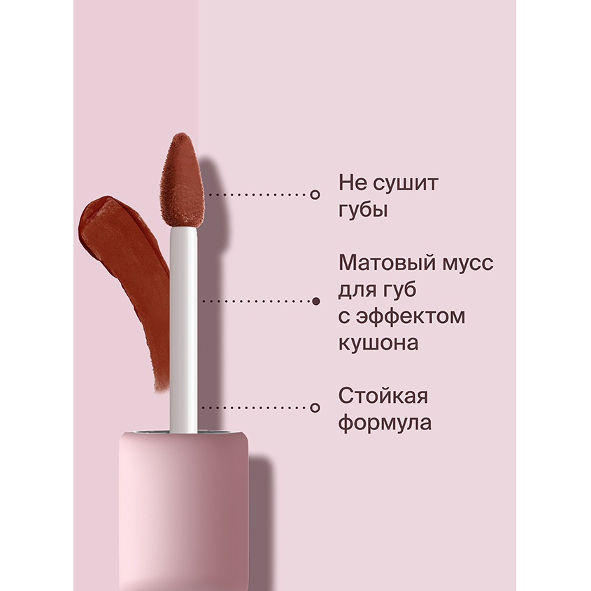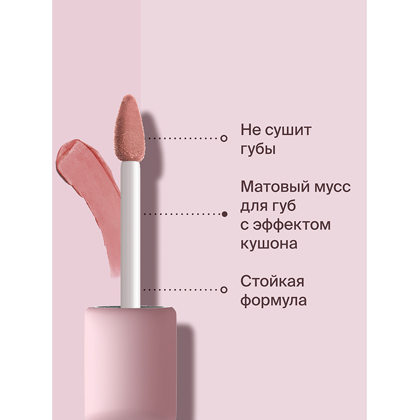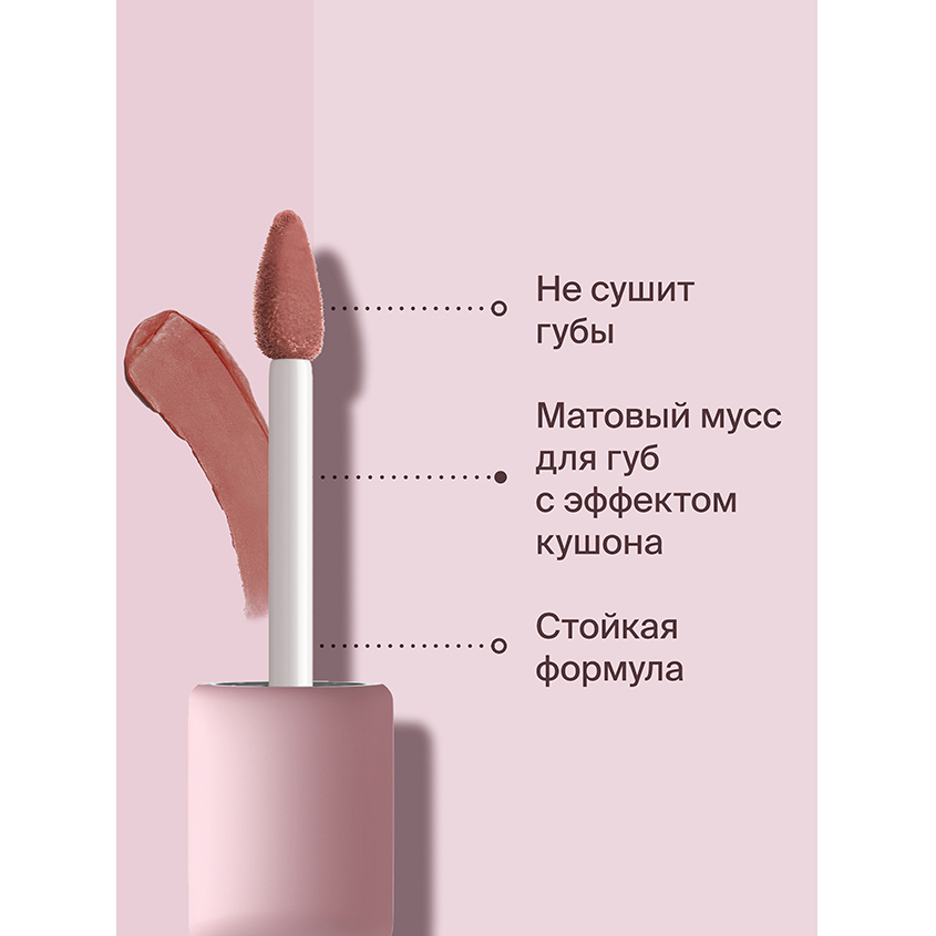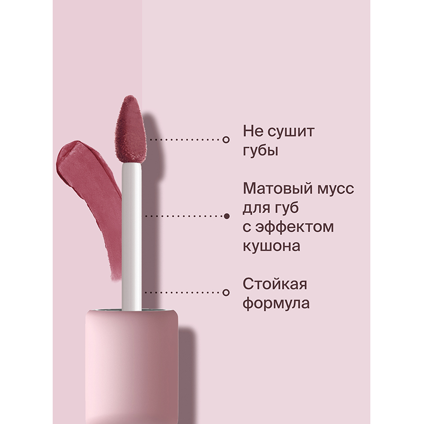 Матовый мусс для губ с эффектом кушона. Шелковистый финиш, стойкая формула. Гелево-пудровая текстура сохраняет увлажненность кожи губ и предотвращает ощущение сухости. Не тестируется на животных