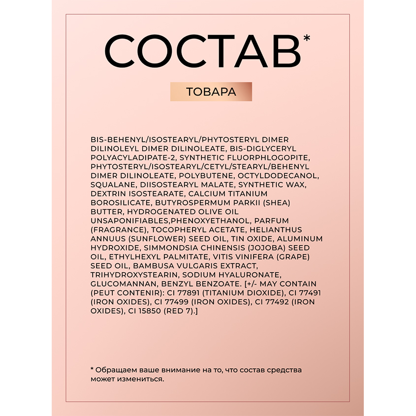 BIS-BEHENYL/ISOSTEARYL/PHYTOSTERYL DIMER DILINOLEYL DIMER DILINOLEATE, BIS-DIGLYCERYL POLYACYLADIPATE-2, PHYTOSTERYL/ISOSTEARYL/CETYL/STEARYL/BEHENYL DIMER DILINOLEATE, POLYBUTENE, OCTYLDODECANOL, SQUALANE, DIISOSTEARYL MALATE, SYNTHETIC WAX, DEXTRIN ISOSTEARATE, ALUMINUM HYDROXIDE, BUTYROSPERMUM PARKII (SHEA) BUTTER, PHENOXYETHANOL, HYDROGENATED OLIVE OIL UNSAPONIFIABLES, PARFUM (FRAGRANCE), TOCOPHERYL ACETATE, HELIANTHUS ANNUUS (SUNFLOWER) SEED OIL, SIMMONDSIA CHINENSIS (JOJOBA) SEED OIL, ETHYLHEXYL PALMITATE, VITIS VINIFERA (GRAPE) SEED OIL, BAMBUSA VULGARIS EXTRACT, COLOPHONIUM (ROSIN, COLOPHANE), TRIHYDROXYSTEARIN, SODIUM HYALURONATE, GLUCOMANNAN, BENZYL BENZOATE. [+/- MAY CONTAIN (PEUT CONTENIR): CI 15985 (YELLOW 6 LAKE), CI 77891 (TITANIUM DIOXIDE), CI 77499 (IRON OXIDES), CI 15850 (RED 7), CI 77491 (IRON OXIDES), CI 77492 (IRON OXIDES), CI 15850 (RED 7 LAKE), CI 45410 (RED 28 LAKE), CI 19140 (YELLOW 5 LAKE), CI 77120 (BARIUM SULFATE), CI 15850 (RED 6 LAKE).].