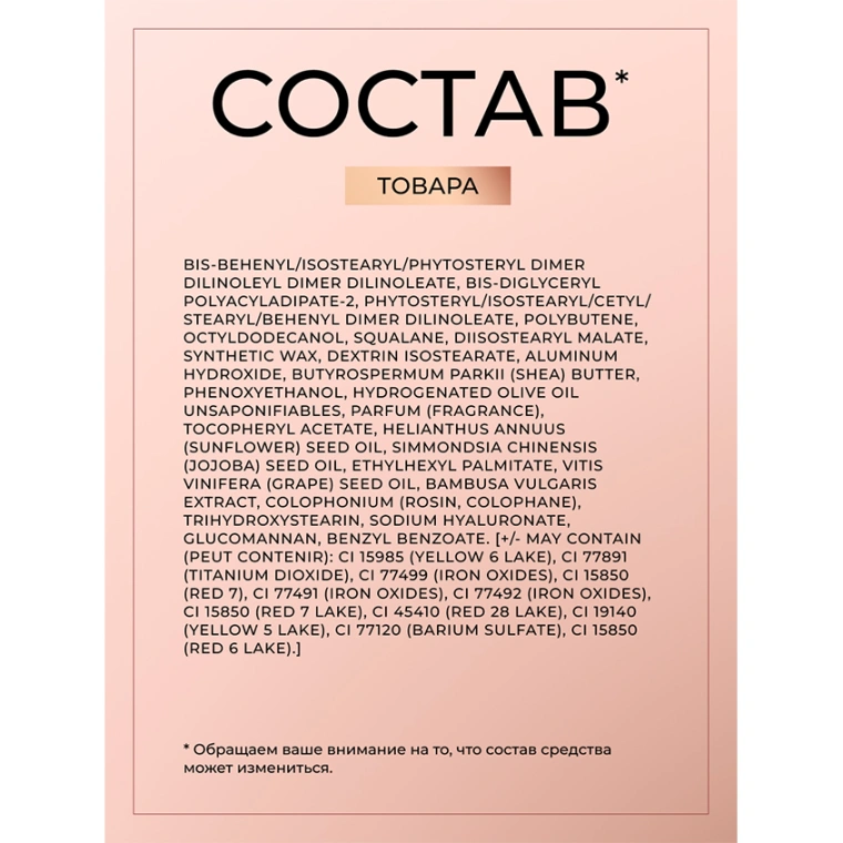 BIS-BEHENYL/ISOSTEARYL/PHYTOSTERYL DIMER DILINOLEYL DIMER DILINOLEATE, BIS-DIGLYCERYL POLYACYLADIPATE-2, PHYTOSTERYL/ISOSTEARYL/CETYL/STEARYL/BEHENYL DIMER DILINOLEATE, POLYBUTENE, OCTYLDODECANOL, SQUALANE, DIISOSTEARYL MALATE, SYNTHETIC WAX, DEXTRIN ISOSTEARATE, ALUMINUM HYDROXIDE, BUTYROSPERMUM PARKII (SHEA) BUTTER, PHENOXYETHANOL, HYDROGENATED OLIVE OIL UNSAPONIFIABLES, PARFUM (FRAGRANCE), TOCOPHERYL ACETATE, HELIANTHUS ANNUUS (SUNFLOWER) SEED OIL, SIMMONDSIA CHINENSIS (JOJOBA) SEED OIL, ETHYLHEXYL PALMITATE, VITIS VINIFERA (GRAPE) SEED OIL, BAMBUSA VULGARIS EXTRACT, COLOPHONIUM (ROSIN, COLOPHANE), TRIHYDROXYSTEARIN, SODIUM HYALURONATE, GLUCOMANNAN, BENZYL BENZOATE. [+/- MAY CONTAIN (PEUT CONTENIR): CI 15985 (YELLOW 6 LAKE), CI 77891 (TITANIUM DIOXIDE), CI 77499 (IRON OXIDES), CI 15850 (RED 7), CI 77491 (IRON OXIDES), CI 77492 (IRON OXIDES), CI 15850 (RED 7 LAKE), CI 45410 (RED 28 LAKE), CI 19140 (YELLOW 5 LAKE), CI 77120 (BARIUM SULFATE), CI 15850 (RED 6 LAKE).].