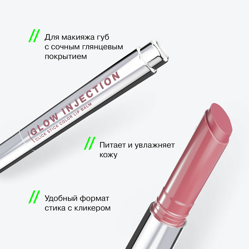 Бальзам для губ в стике Glow Injection - это инновационный продукт-гибрид, который делает их невероятно глянцевыми, притягательными, гладкими и визуально более объемными. Пчелиный воск и витамин Е в составе бальзама Glow Injection питают кожу и делают ее мягкой и гладкой. Универсальные полупрозрачные оттенки с сияющим финишем подходят для любого образа и настроения, а невесомая текстура позволяет добиться желаемого эффекта – от легкого полупрозрачного покрытия до более интенсивного и ослепительного. Инновационный футляр с click stick механизмом позволяет точно дозировать продукт и обеспечивает равномерное распределение бальзама по коже, а инновационная кремовая текстура SMART GUARD смягчает и увлажняет губы.