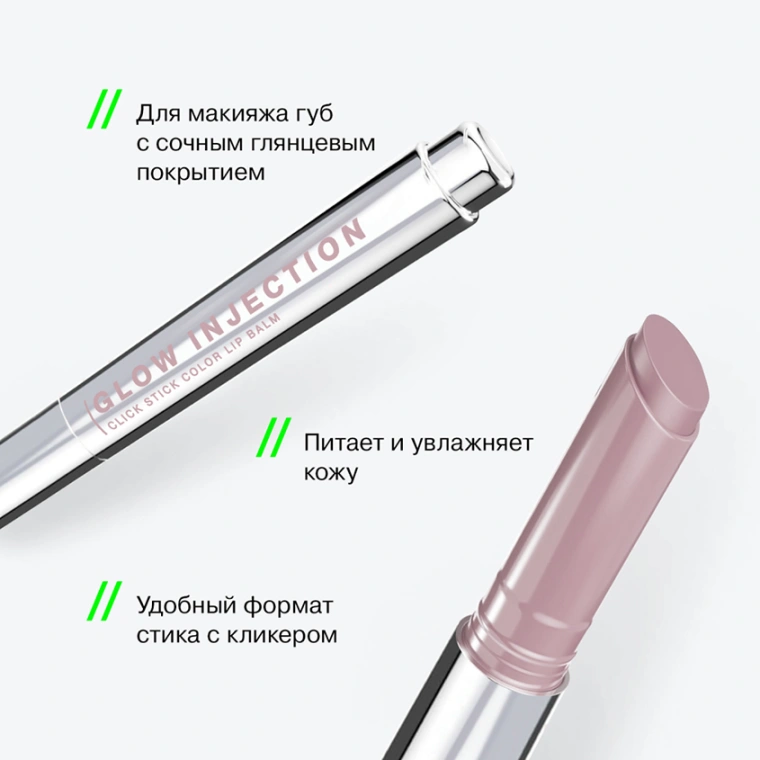 Бальзам в стике GLOW INJECTION от INFLUENCE BEAUTY с тающей текстурой — это инновационный продукт-гибрид, который делает губы невероятно глянцевыми, притягательными, гладкими и визуально более объемными. В обновленной палитре 14 универсальных оттенков с глянцевым финишем, которые подходят для любого образа и настроения. Инновационная кремовая текстура SMART GUARD позволяет добиться желаемого эффекта: от легкого полупрозрачного покрытия до более интенсивного и ослепительного. Бальзам с ароматом малины содержит пчелиный воск и витамин Е для питания, смягчения и увлажнения кожи. У GLOW INJECTION инновационный футляр с механизмом click stick — нажмите на кнопку и нанесите необходимое количество бальзама на губы. Он позволяет точно дозировать продукт, обеспечивает его равномерное распределение по коже и подходит для прорисовки любой формы губ.