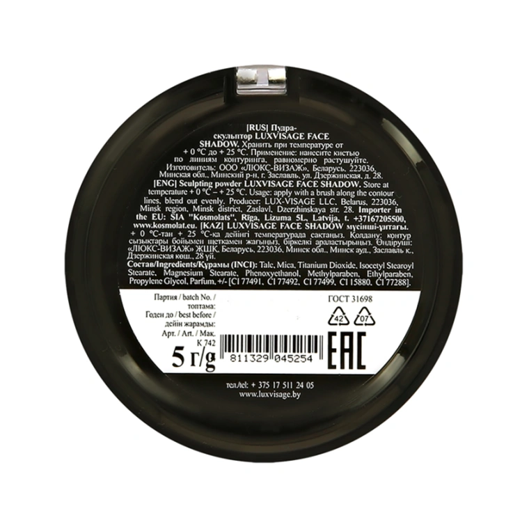 Позволяет естественно подчеркнуть и визуально скорректировать форму и контуры лица за счет создания эффекта натуральной тени. Шелковистая мелкодисперсная текстура с матовым финишем легко набирается на кисть, равномерно растушевывается без видимых границ нанесения и пятен. Не подчеркивает морщинки и шелушения, делает лицо более выразительным. 2 натуральных бежевых оттенка с холодным и теплым подтоном. Не содержит ингредиентов животного происхождения.