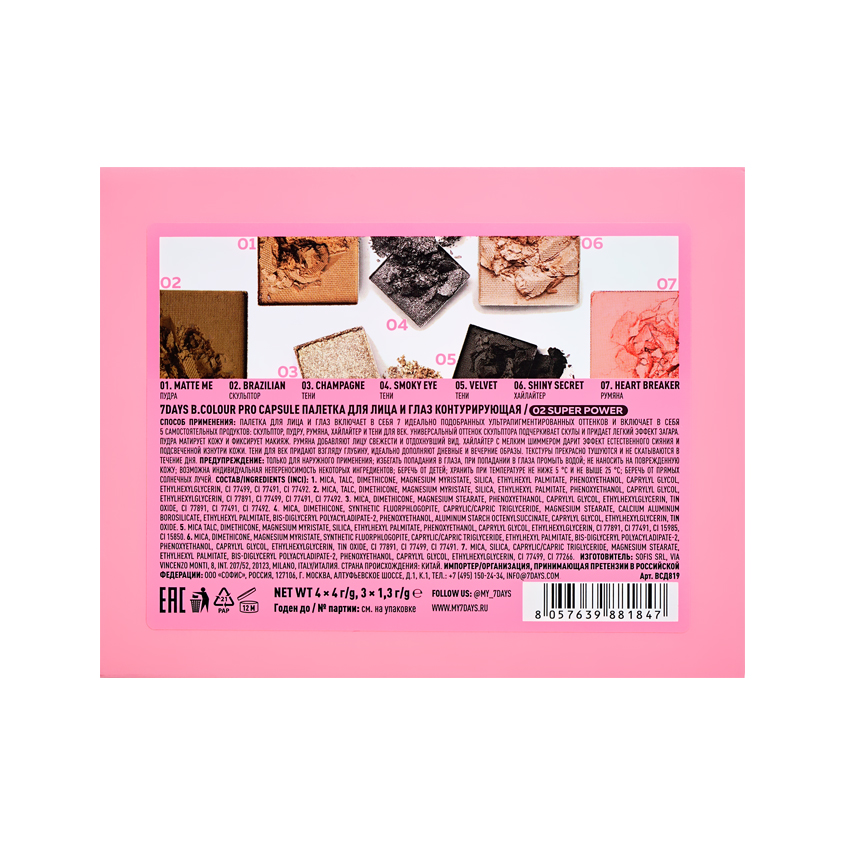 MICA, TALC, DIMETHICONE, MAGNESIUM MYRISTATE, SILICA, ETHYLHEXYL PALMITATE, PHENOXYETHANOL, CAPRYLYL GLYCOL, ETHYLHEXYLGLYCERIN, CI 77499, CI 77491, CI 77492. 2. MICA, TALC, DIMETHICONE, MAGNESIUM MYRISTATE, SILICA, ETHYLHEXYL PALMITATE, PHENOXYETHANOL, CAPRYLYL GLYCOL, ETHYLHEXYLGLYCERIN, CI 77891, CI 77499, CI 77491, CI 77492. 3. MICA, DIMETHICONE, MAGNESIUM STEARATE, PHENOXYETHANOL, CAPRYLYL GLYCOL, ETHYLHEXYLGLYCERIN, TIN OXIDE, CI 77891, CI 77491, CI 77492. 4. MICA TALC, DIMETHICONE, MAGNESIUM MYRISTATE, SILICA, ETHYLHEXYL PALMITATE, PHENOXYETHANOL, CAPRYLYL GLYCOL, ETHYLHEXYLGLYCERIN, CI 77891, CI 77491, CI 15985, CI 15850. 5. MICA, DIMETHICONE, SYNTHETIC FLUORPHLOGOPITE, CAPRYLIC/CAPRIC TRIGLYCERIDE, MAGNESIUM STEARATE, CALCIUM ALUMINUM BOROSILICATE, ETHYLHEXYL PALMITATE, BIS-DIGLYCERYL POLYACYLADIPATE-2, PHENOXYETHANOL, ALUMINUM STARCH OCTENYLSUCCINATE, CAPRYLYL GLYCOL, ETHYLHEXYLGLYCERIN, TIN OXIDE. 6. MICA, DIMETHICONE, MAGNESIUM MYRISTATE, SYNTHETIC FLUORPHLOGOPITE, CAPRYLIC/CAPRIC TRIGLYCERIDE, ETHYLHEXYL PALMITATE, BIS-DIGLYCERYL POLYACYLADIPATE-2, PHENOXYETHANOL, CAPRYLYL GLYCOL, ETHYLHEXYLGLYCERIN, TIN OXIDE, CI 77891, CI 77499, CI 77491. 7. MICA, SILICA, CAPRYLIC/CAPRIC TRIGLYCERIDE, MAGNESIUM STEARATE, ETHYLHEXYL PALMITATE, BIS-DIGLYCERYL POLYACYLADIPATE-2, PHENOXYETHANOL, CAPRYLYL GLYCOL, ETHYLHEXYLGLYCERIN, CI 77499, CI 77266.