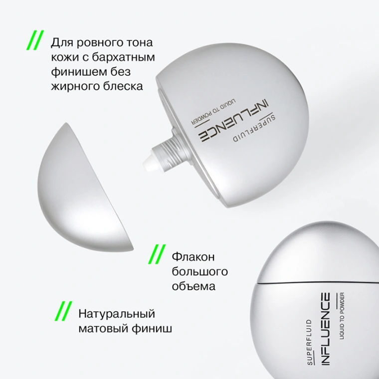 SUPERFLUID от INFLUENCE BEAUTY — тональная основа с эффектом пудры, вдохновленная невесомостью супержидкостей. Нанесите ее на лицо, чтобы придать коже матовый финиш. Благодаря технологии LIQUID TO POWDER крем создает покрытие с эффектом припудренной кожи. Он выравнивает рельеф, маскирует поры и несовершенства на лице. У средства технологичный обтекаемый флакон футуристичной формы с покрытием soft-touch, который приятно держать в руке. Упаковка имеет большой объем — 35 мл. В линейке пять оттенков с разным подтоном. SUPERFLUID с невесомой жидкой текстурой легко распределяется по коже и оставляет бархатный финиш без жирного блеска на весь день.
