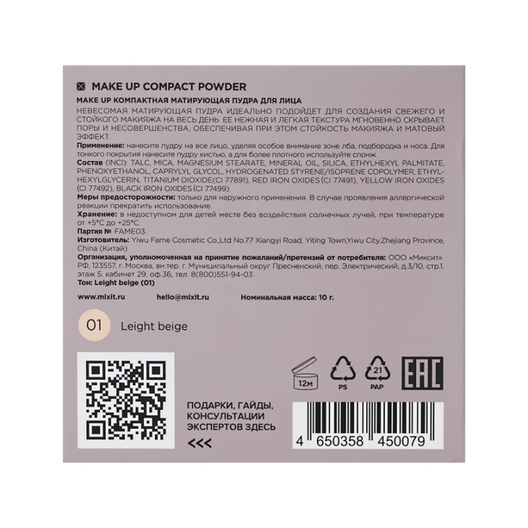 Пудра для лица `MIXIT` COMPACT POWDER компактная матирующая тон 01 Leight beige