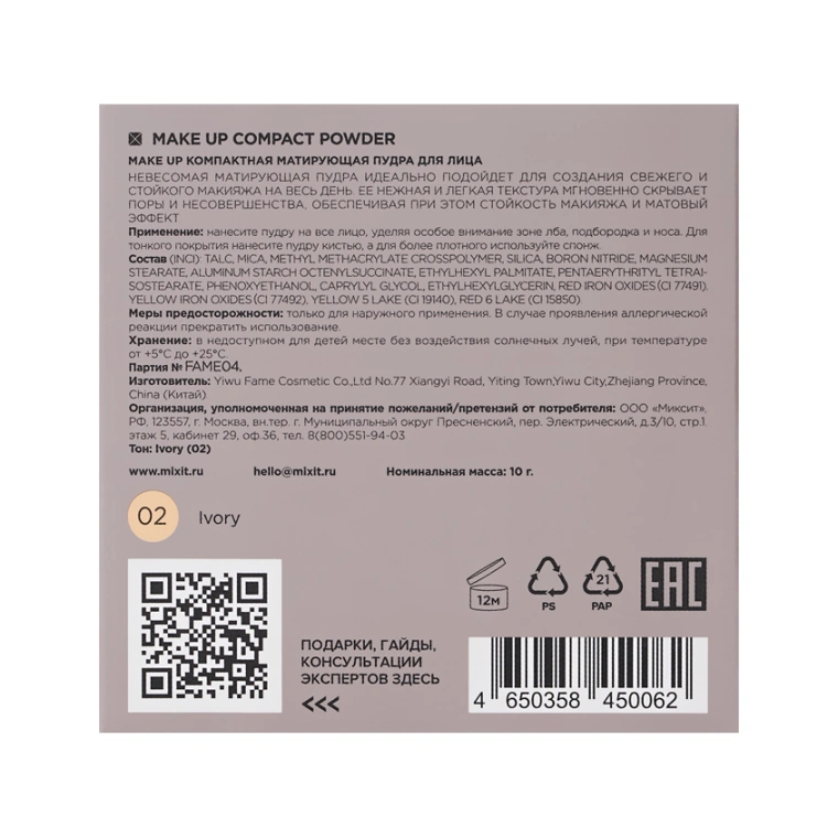 Пудра для лица `MIXIT` COMPACT POWDER компактная матирующая тон 02 Ivory