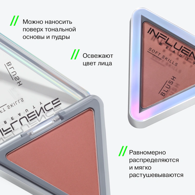 Благодаря технологии ADAPTSKILL румяна SOFT SKILLS от INFLUENCE BEAUTY адаптируются к поверхности кожи, не подчеркивая ее рельеф. Они легко наносятся, растушевываются и распределяются как поверх тональной основы, так и поверх пудры. Нестандартная упаковка треугольной формы и минималистичный дизайн дополняют футуристичный характер продукта. Для естественного финиша и качественного макияжа наносите небольшое количество румян SOFT SKILLS кистью на увлажненную кожу. Используйте оттенки румян, которые не более чем на два-три тона темнее вашего естественного тона. В ассортименте 6 тонов. Продукция не тестируется на животных и не содержит в своём составе компонентов животного происхождения.