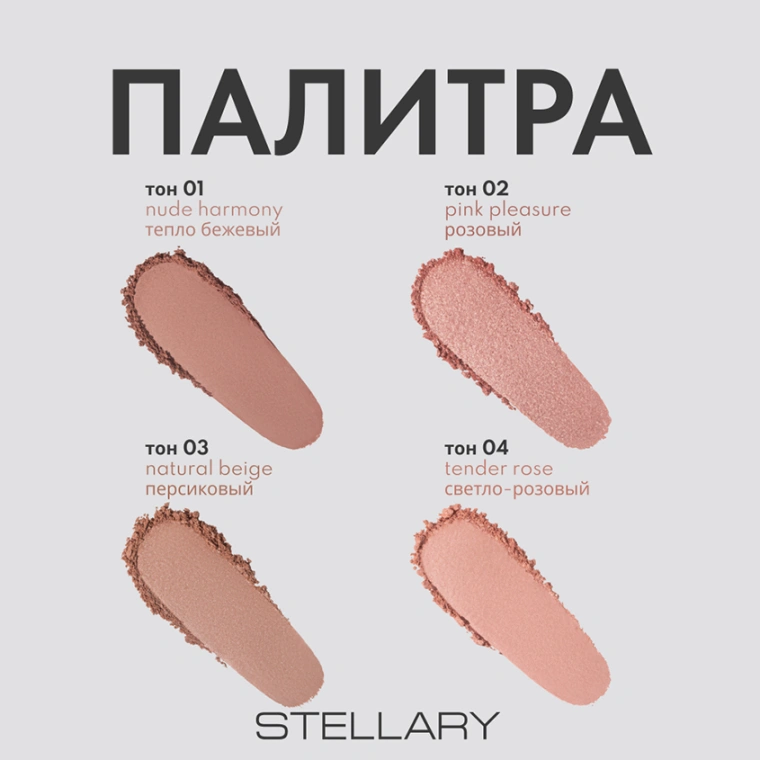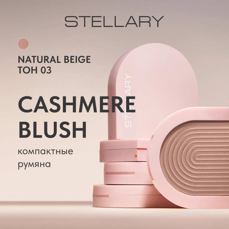 Компактные пудровые румяна CASHMERE BLUSH от STELLARY вдохновлены струящимся люксовым кашемиром и изгибами женского тела. Это квинтэссенция роскошной женственности: чувственность, грациозность, плавность линий и бархатистость текстуры. Элегантная феминность воплощается в каждой составляющей продукта: шелковистой текстуре, мягких изгибах упаковки, нежно-розовом оттенке пластика, нюдовой палитре. Румяна с пудровой текстурой равномерно распределяются по коже, легко тушуются, придавая естественный оттенок здорового румянца, создавая плавные переходы и корректируя пропорции лица. Четыре натуральных оттенка добавят макияжу выразительности: тон 01 Nude Harmony — тепло-бежевый, тон 02 Pink Pleasure — розовый, тон 03 Natural Beige — персиковый, тон 04 Tender Rose — светло-розовый. Румяна не подчеркивают текстуру кожи, а входящие в состав компоненты и минералы обеспечивают однородность, легкость нанесения и устойчивость. Дизайн упаковки в форме арки из матового пластика в нюдовом цвете сочетает в себе чувственность и лаконичность, грациозность и нежность. Золотой логотип на лицевой части добавляет изысканности и статусности продукту.