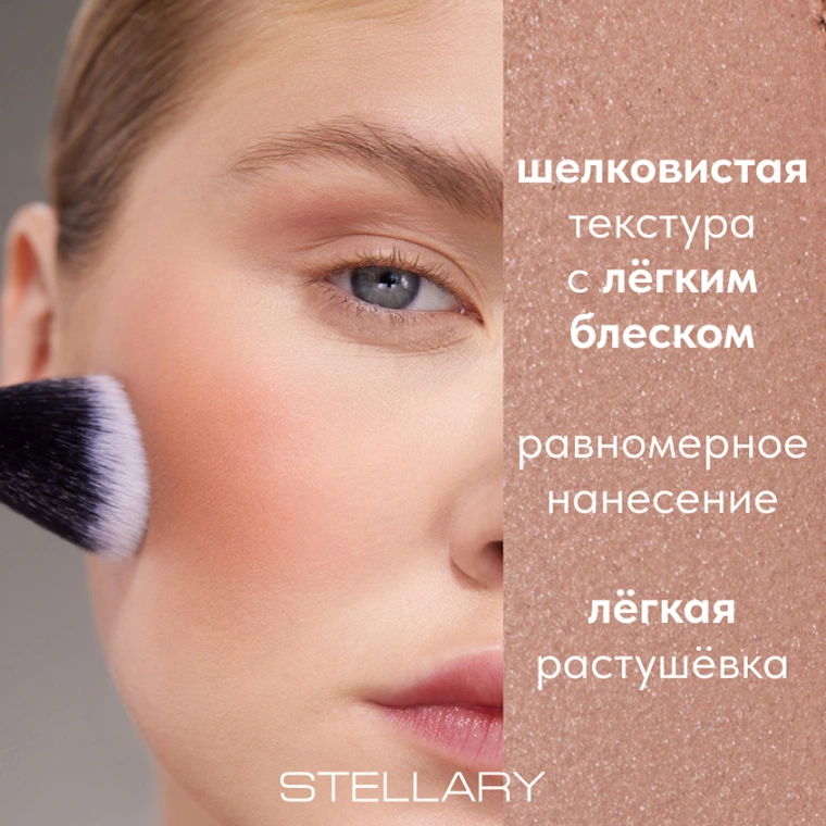 нанести румяна плотным слоем. Рекомендуется использовать кисть для румян и контуринга STELLARY №135 PRO для растушевки. Можно использовать вместе с жидкими румянами CHICK BLUSH от STELLARY: сначала нанести жидкие румяна, а потом зафиксировать их сухими румянами CASHMERE BLUSH.