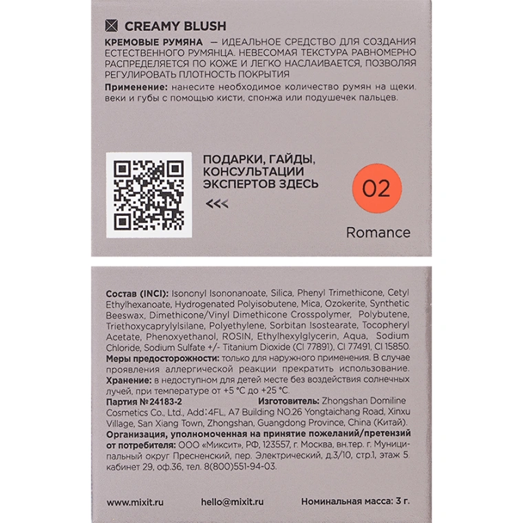 Румяна для лица `MIXIT` CREAMY BLUSH кремовые тон 02 Romance