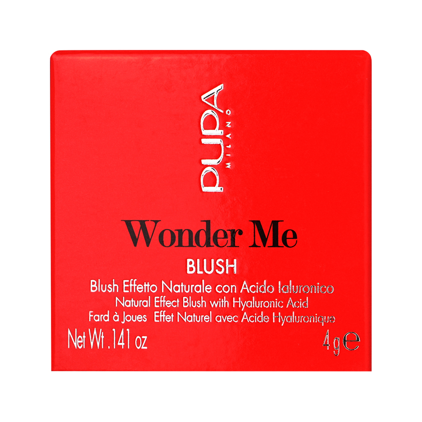 За последние годы тренд в макияже заметно сместился в сторону эффекта « МАКИЯЖ БЕЗ МАКИЯЖА». Текстуры стали тонкими и легкими, но при этом сохраняют свое качество. Бренд PUPA идет в ногу со временем и предлагает вам совершенно новый продукт! Румяна для лица WONDER ME BLUSH лёгкой текстуры с отличной цветопередачей. Плотность покрытия можно регулировать, добиваясь необходимого эффекта. Румяна создают свежий и естественный макияж, который сливается с цветом лица без эффекта пудры, создавая натуральный эффект, который выглядит так, будто на коже нет румян. Гиалуроновая кислота, содержащаяся в румянах, помогает увлажнить кожу и сделать ее более упругой, гладкой и свежей. Три эффекта покрытия в линейки: