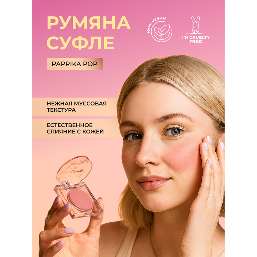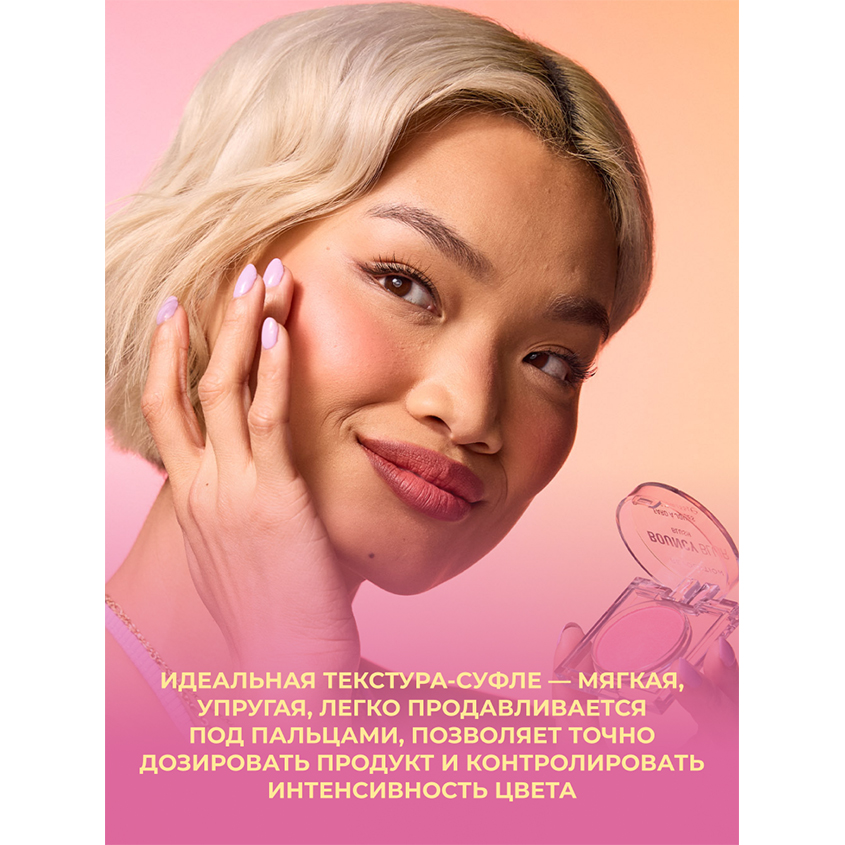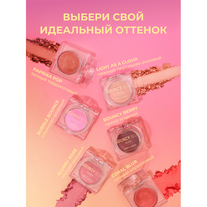 Bouncy Blur Blush — это румяна с уникальной текстурой «мусс», которая создаёт на коже естественное, мягкое сияние и свежий румянец. Лёгкая текстура румян легко наносится и плавно растушёвывается, придавая лицу здоровый оттенок без резких линий. Формула с эффектом «blur» скрывает неровности кожи и делает её визуально гладкой, а мягкое покрытие дарит лёгкость и натуральный вид. Румяна обладают длительной стойкостью, сохраняя свежесть макияжа в течение всего дня. Идеальны для создания как лёгкого дневного, так и яркого вечернего образа, румяна подойдут для любого типа кожи и оттенка. Revolution не используют компоненты животного происхождения и те, что тестируются на животных ни на одном из этапов производства. Создатели бренда убеждены, что все существа имеют право на жизнь и свободу. Веганский продукт.
