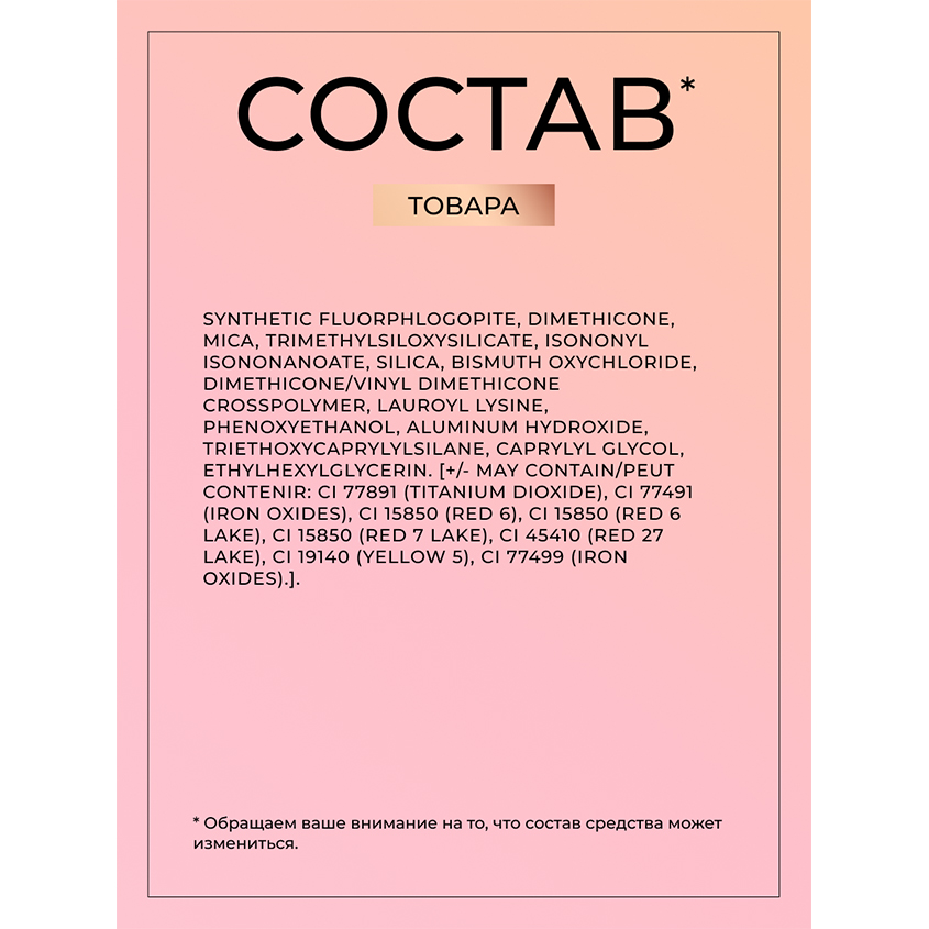 SYNTHETIC FLUORPHLOGOPITE, DIMETHICONE, MICA, TRIMETHYLSILOXYSILICATE, ISONONYL ISONONANOATE, SILICA, BISMUTH OXYCHLORIDE, DIMETHICONE/VINYL DIMETHICONE CROSSPOLYMER, LAUROYL LYSINE, PHENOXYETHANOL, ALUMINUM HYDROXIDE, TRIETHOXYCAPRYLYLSILANE, CAPRYLYL GLYCOL, ETHYLHEXYLGLYCERIN. [+/- MAY CONTAIN/PEUT CONTENIR: CI 77891 (TITANIUM DIOXIDE), CI 77491 (IRON OXIDES), CI 15850 (RED 6), CI 15850 (RED 6 LAKE), CI 15850 (RED 7 LAKE), CI 45410 (RED 27 LAKE), CI 19140 (YELLOW 5), CI 77499 (IRON OXIDES).].