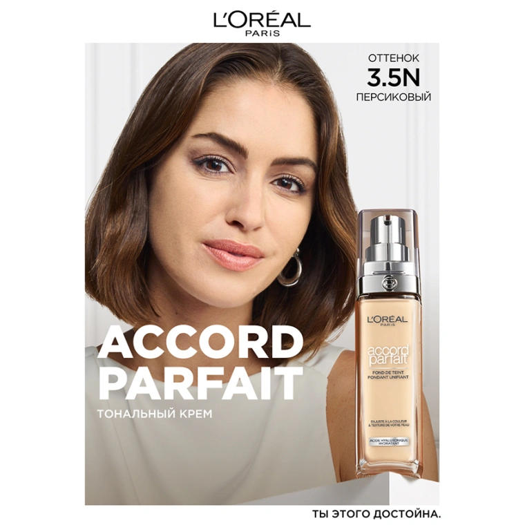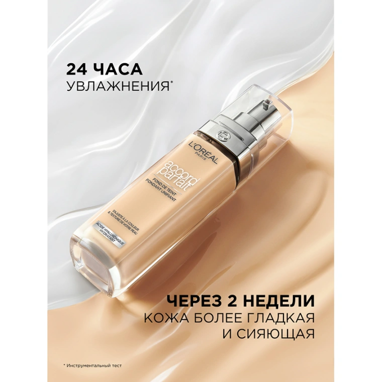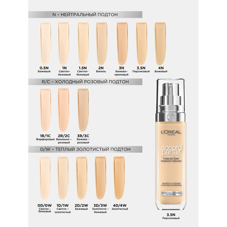 Жидкий тональный крем Accord Parfait от L'Oreal Paris выравнивает тон, подстраивается к цвету и текстуре кожи. Заметно преображает кожу за 2 недели применения: кожа более гладкая и сияющая. Ультра-тонкие пигменты подстраиваются под тон и подтон кожи. Формула на 80%, состоящая из увлажняющего крема с гиалуроновой кислотой. 24 часа увлажнения вашей кожи. Естественный финиш, сияющая кожа. SPF 16. КАК ПОДОБРАТЬ ТОН: номер обозначает интенсивность тона: от самого светлого 0.5 к темному 4. Буква обозначает подтон: N - для нейтрального подтона, R / C - для холодного розового подтона, D / W для теплого золотистого подтона. SPF 16